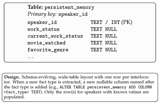 Relational data model for the proposed persistent memory. The system maintains a single table keyed by speaker_id and adds columns on demand for newly discovered fact types.