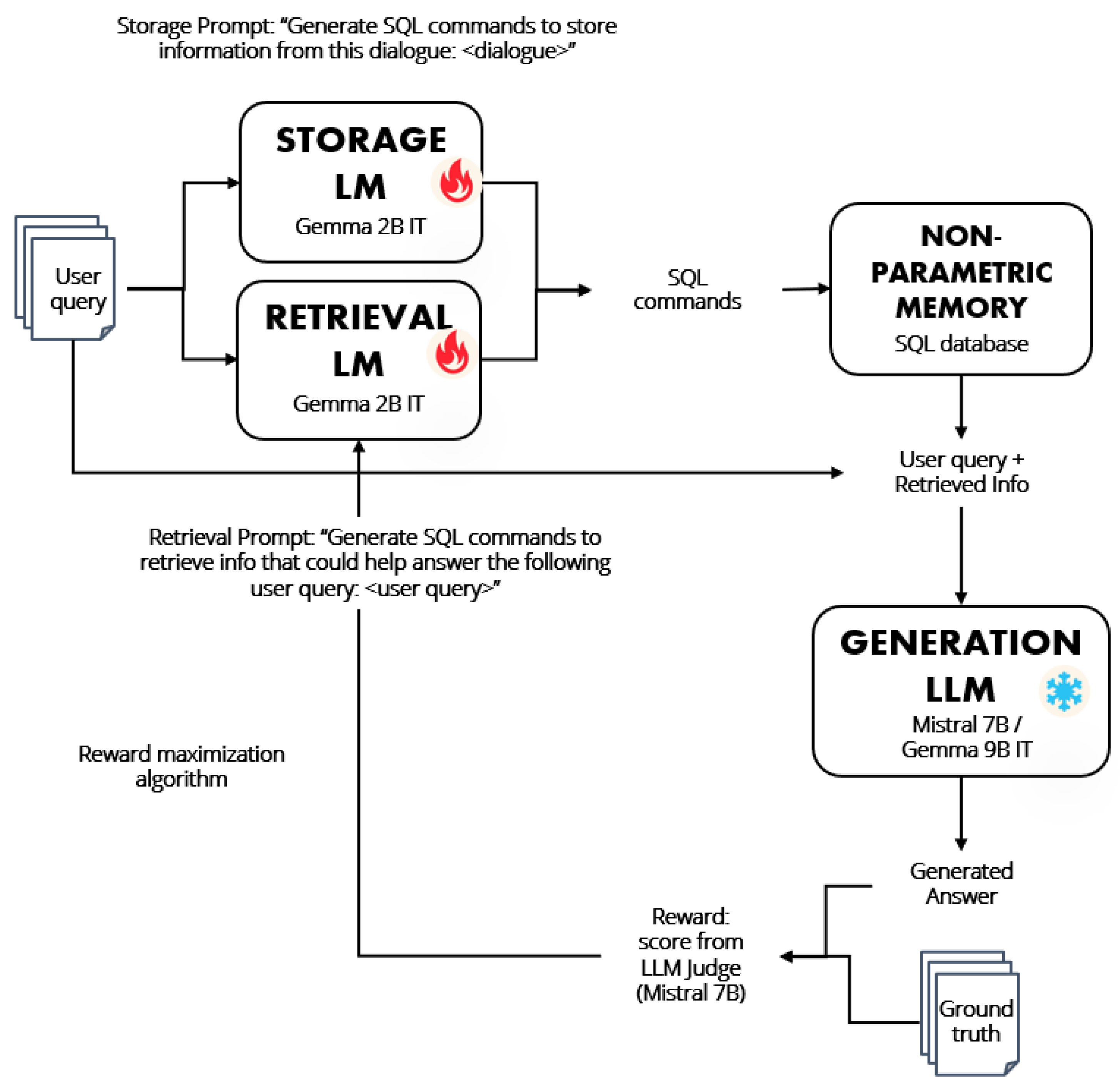 As we generate the labels and , which consist of SQL commands, we execute them using a Python script to store facts about the speakers into a SQL table. Once all of the labels for a given multi-session chat have been generated and executed, we pass the final question q into the retrieval model to generate a series of SQL commands , which is sampled according to . We then execute the SQL commands in r to retrieve information i from the SQL table and enter the information, along with the question q, into the generation LLM to generate the final predicted answer according to , where adds its own instructions to the prompt for generating answers. Finally, the predicted answer is passed along with the question q and the ground truth answer g to the LLM judge, , which adds instructions for generating either the token “CORRECT” or “WRONG” and we obtain the probability of “CORRECT” as . If c is greater than some threshold , then we give a reward R of 1 and the reward is 0 otherwise.