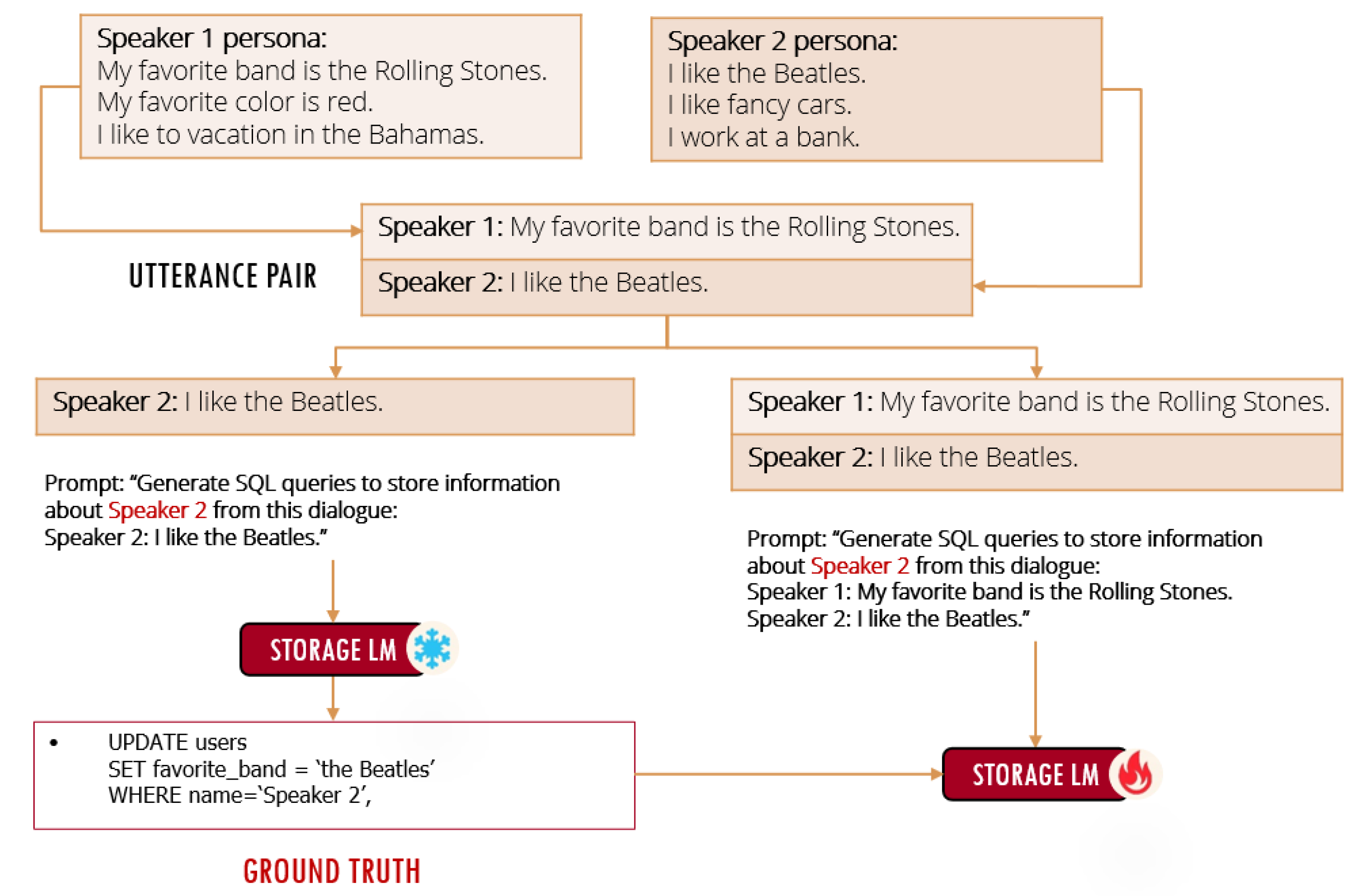 Table 2, we show an example of how the lines in the dialogue history are split into pairs to be fed as input into the storage language model. The outputs that we expect from