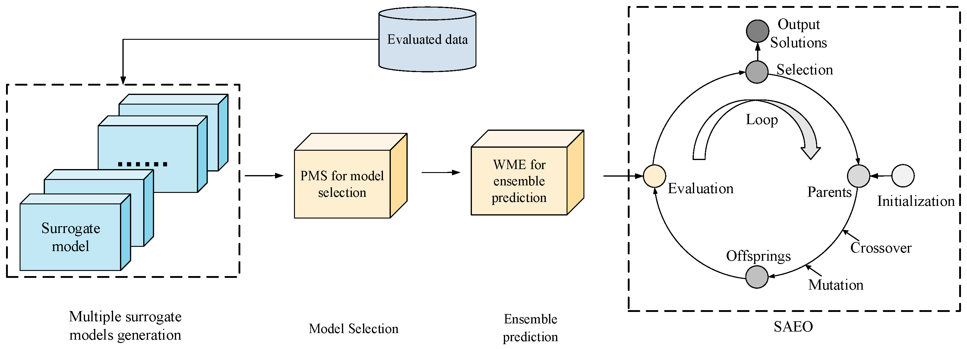 Despite numerous advancements, balancing prediction accuracy and generalization ability remains a critical challenge in the design of SAEAs, which restricts their applicability in solving EOPs. To address this, a novel probability selection-based SAEA (PS-SAEA) is proposed in this paper to more effectively tackle EOPs. Specifically, a probabilistic model selection (PMS) strategy is introduced to select promising surrogate models in a stochastic manner, thereby avoiding the overfitting commonly caused by greedy selection mechanisms. In addition, a weighted model ensemble (WME) method is developed to integrate the selected models, with weighting determined by each model’s prediction error, to produce more accurate fitness estimations.