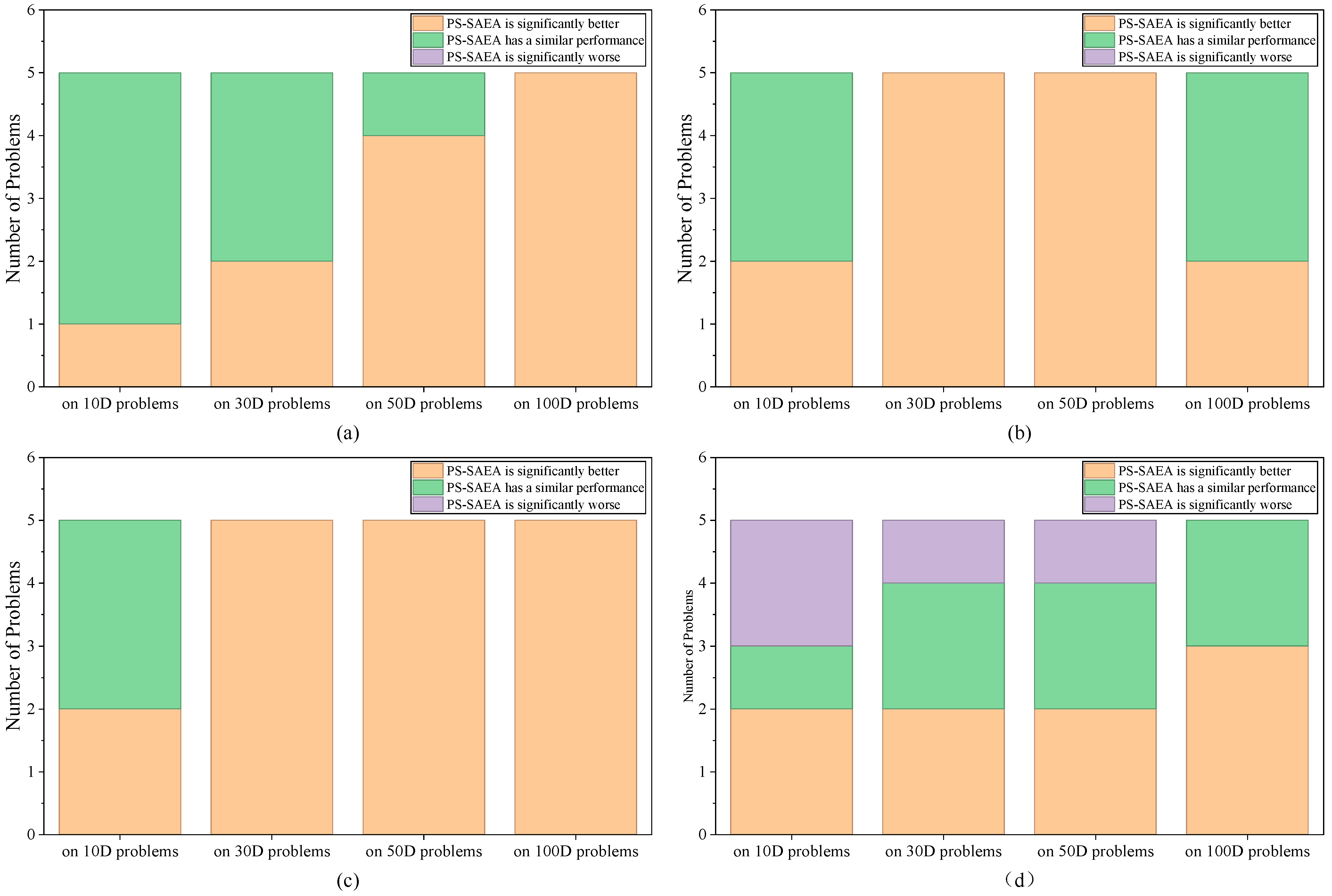 Figure 2 plots the number of better, similar, and worse results obtained by the PS-SAEA when compared with different SAEAs.