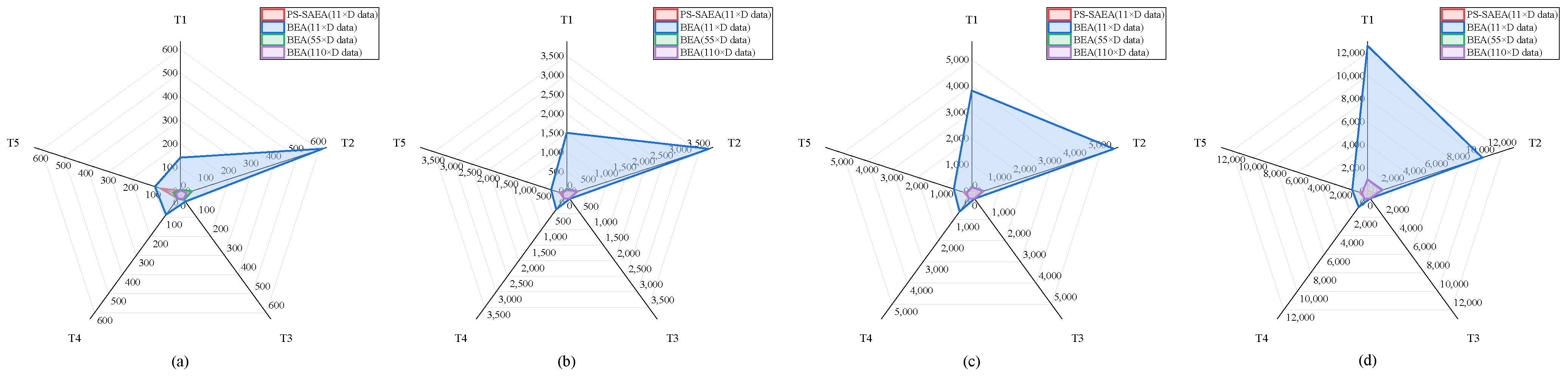 D = 100, the execution time drops from 1398.481 s with a single thread to 125.131 s with 12 threads, yielding an approximate 11.2× speedup. A similar trend is observed on T5, where the time reduces from 1437.782 s to 128.445 s under the same configuration, corresponding to an 11.2× acceleration. These results confirm that the proposed PS-SAEA framework scales effectively with the number of computing threads.