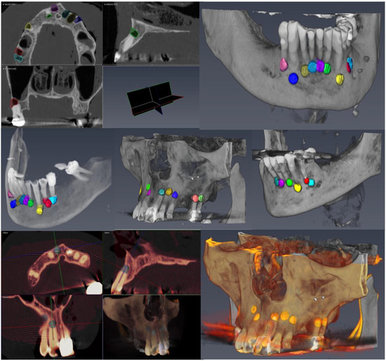 The pre-operative CT scans were performed with a GE Revolution 256 CT scanner (General Electric Healthcare, Chicago, IL, USA) with axial scanning (with the voxel size of 0.625 mm, spaced 0.625 mm, 120 kVp, 200 mA, and the rotation time equal to 1 s). DICOM datasets of the CTs were uploaded into corresponding DNS software programs. Virtual surgical planning of the DNS sites—access point, angle, and depth of drilling––was performed, taking into account the need to avoid the neighboring anatomical structures (the maxillary sinus, the floor of the nasal cavity, the mental foramen, and the inferior alveolar nerve). The FH sites were analyzed on the CT slices by the operators; osteotomy, root-end resection, and ultrasonic retro-cavity preparation were performed with a dental operating microscope Extaro 300 (Zeiss, Oberkochen, Germany).
