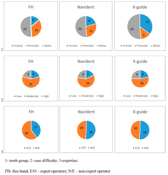 Statistical analyses were performed using the R software (R version 4.2.1, 23 June 2022). Descriptive statistics are expressed as Mean ± Standard Deviation (SD) for continuous variables. The significance level was set at p ≤ 0.05. To determine whether the proportions of categorical variables (type of tooth, difficulty, expertise of operator) are homogeneous across different groups, the Chi-square test for homogeneity was used. Intraclass correlation coefficient (ICC) and Fleiss’ Kappa were used to assess consistency among the evaluators of continuous and categorical measurements, respectively. The Shapiro–Wilk test was used to analyze the normality of the distribution of the quantitative variables and Student’s t-test or Mann–Whitney U test were used to estimate statistically significant differences in the variables. One-way and two-way ANOVAs were performed to assess the effects of operative technique (Free Hand, Navident, X-Guide) and operator experience (expert vs. non-expert) on each quantitative outcome. To account for potential confounding factors, including tooth type and jaw (maxilla vs. mandible), and to evaluate the combined influence of technique and operator experience on all outcome variables simultaneously, a multivariate analysis of variance (MANOVA) was conducted. For prognostic factor analysis, linear regression models were used for continuous variables and generalized linear models (GLMs) for categorical outcomes. Initially, univariate models were applied to each independent variable (type of tooth, case difficulty, expertise of operator) to identify significant factors. A multivariate model was then used to assess the combined effect of these variables on the outcomes, accounting for interactions between independent variables.