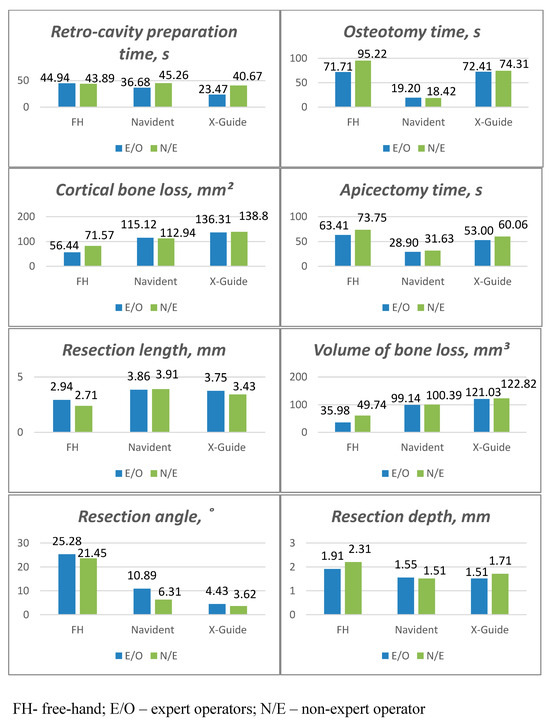 The accuracy of each method was evaluated in all the groups by measuring the following outcome parameters: coronal/platform linear deviation (ΔLD_C, mm), apical linear deviation (ΔLD_A, mm), angular deviation (ΔAD, °), volume of substance loss (ΔV, mm3), cortical bone loss (ΔS, mm2); angle (ΔrA, °), length (ΔrL, mm), and depth of the apical resection (ΔrD, mm); preparation of the retro-cavity (consistency with channel axis and depth of the retrograde preparation, mm). The efficiency of each method was evaluated in all groups by measuring the following outcomes: procedural time of the osteotomy (ΔT_OT, s), procedural time of apicectomy (ΔT_AT, s), retrograde preparation time (ΔT_PT, s), complications during apicectomy (irregular bevel, incomplete resection), and others, such as iatrogenic damages (invasion of the maxillary sinus, mandibular canal, damage to the mental nerve, perforation of the opposite cortex or floor of the nasal cavity) of experienced operators and non-expert operators (E/O, N/E), were also recorded.