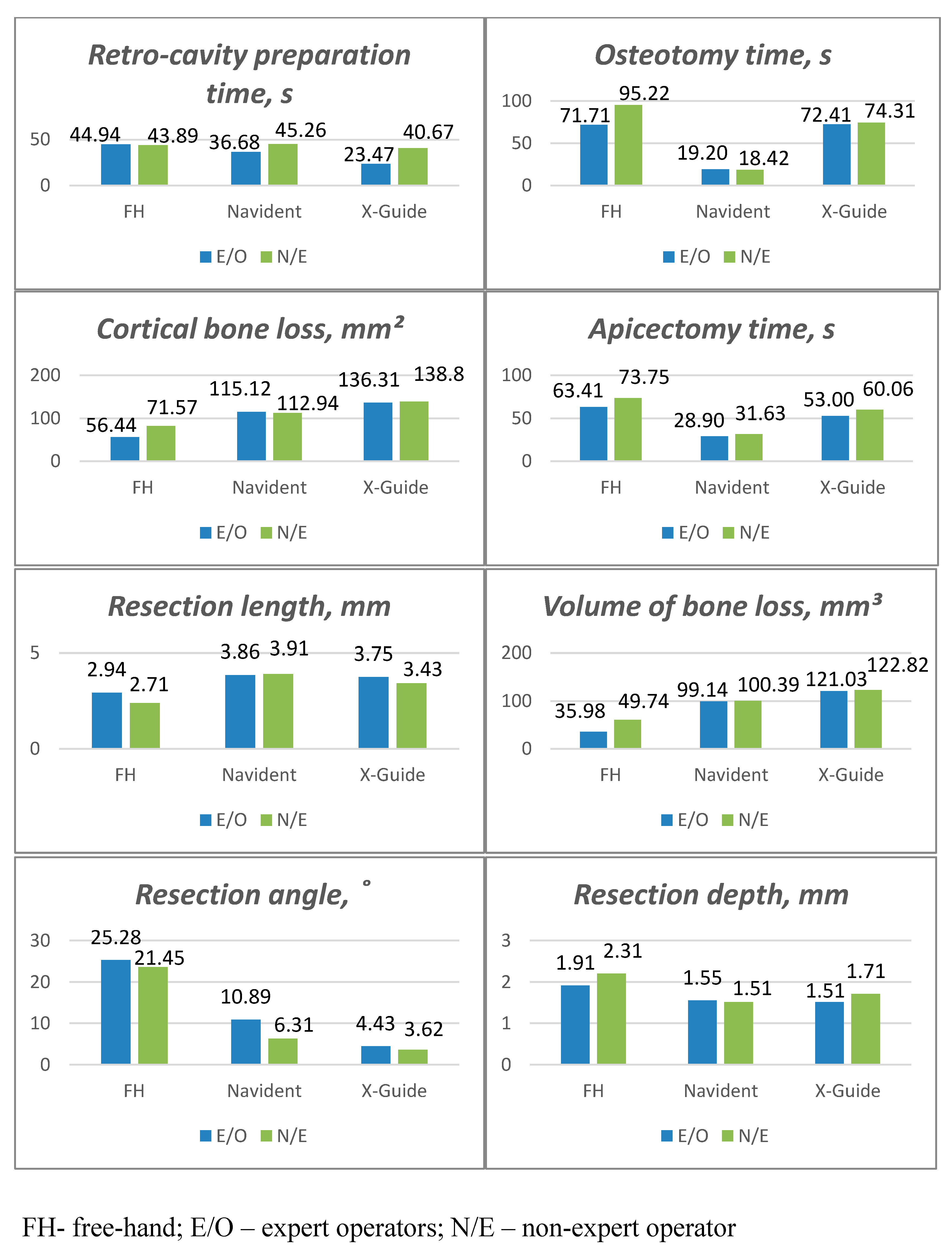 21] reported that the time required for osteotomy and root-end resection using an FH approach was double that of the DNS approach, regardless of operator experience. We, on the other hand, underlined that experts were faster in the Navident and X-guide groups. It was not possible to compare with studies of combined procedural stages, such as with Tang et al. [