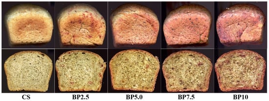 The external appearance of the loaves and their crumbs of the tested wheat–oat breads with beetroot pomace: CS—control sample; BP2.5–BP10—bread with 2.5, 5.0, 7.5, and 10% of beetroot pomace.