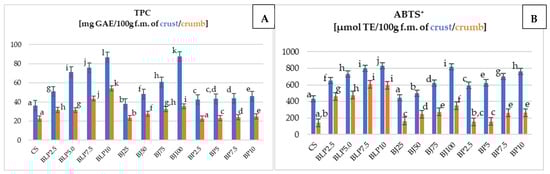 The total phenolic content (TPC) (A) and antioxidant activity ABTS+ (B) of crust and crumb of tested wheat–oat breads with beetroot-based additives. Mean values from three repetitions ± SD. Values followed by the same superscript letters do not significantly differ at a significance level of 0.05, separately for the crumb and crust. Abbreviations: CS—control sample; BLP2.5–BLP10—bread with 2.5, 5.0, 7.5, and 10% of beetroot lyophilizate powder; BJ25–BJ100—bread with 25, 50, 75, and 100% of beetroot juice; BP2.5–BP10—bread with 2.5, 5.0, 7.5, and 10% of beetroot pomace; GAE—gallic acid equivalent; ABTS+—method of measuring antioxidant activity; TE—Trolox Equivalent; f.m.—fresh mass.
