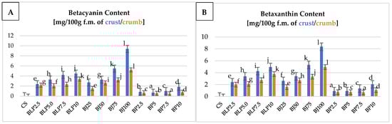The content of betacyanin (A) and betaxanthin (B) of the crust and crumb of tested wheat–oat breads with beetroot-based additives. Mean values from three repetitions ± SD. Values followed by the same superscript letters do not significantly differ at a significance level of 0.05, separately for the crumb and crust. Abbreviations: CS—control sample; BLP2.5–BLP10—bread with 2.5, 5.0, 7.5, and 10% of beetroot lyophilizate powder; BJ25–BJ100—bread with 25, 50, 75, and 100% of beetroot juice; BP2.5–BP10—bread with 2.5, 5.0, 7.5, and 10% of beetroot pomace; f.m.—fresh mass.