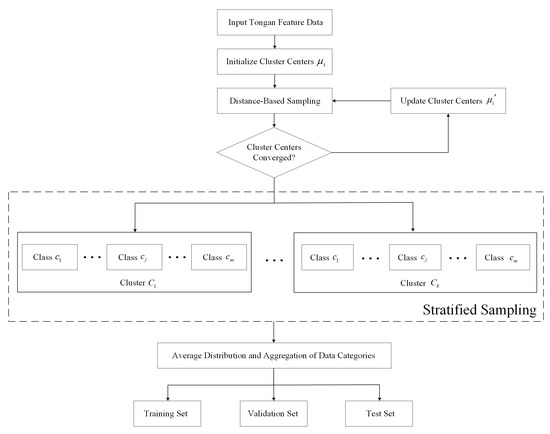 To achieve more balanced data partitioning, this study integrates stratified sampling with the improved weighted K-Means clustering method. Specifically, samples are first stratified according to their distances from the cluster centroids, and proportional sampling is then applied within each cluster to ensure balanced class representation across the training, validation, and test sets. The overall procedure of this data partitioning method is illustrated in Figure 3.