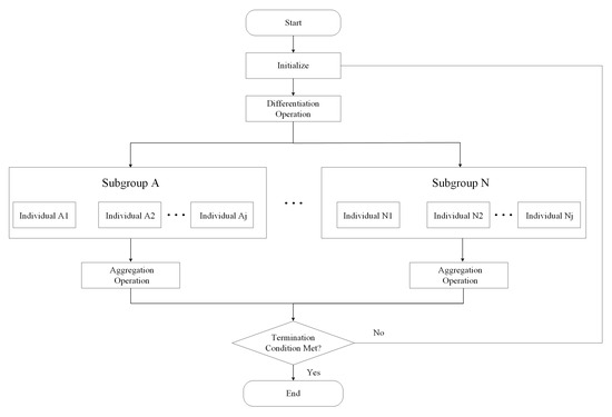 Although this strategy increases parameter flexibility, it is still susceptible to local optima in complex search spaces, particularly when fitness differences among individuals are minimal. This limitation reduces adaptability and hinders global exploration. Moreover, AGA encounters challenges in balancing evolutionary speed and search quality: overly aggressive adjustment rates may lead to divergence and inefficiency, whereas overly conservative rates restrict the search range and degrade performance. To address these limitations, this study integrates the MEA framework to further enhance AGA. MEA simulates human-like rapid evolution through learning and innovation, thereby improving both adaptability and global search capability. In each iteration, a randomly initialized population undergoes fitness-based selection to generate a central individual, which partitions the population into elite and temporary subpopulations. The elite group preserves high-quality solutions, while the temporary group performs exploratory search, together enabling cooperative optimization. The procedure is illustrated in Figure 5.