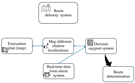 Figure 2 presents the interconnections among the main elements of the route delivery system, including: an evacuation map, a map of different relative localizations, a decision support system, real-time data collected from the alarm system’s sensors, and an output route determination.