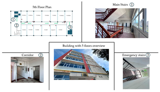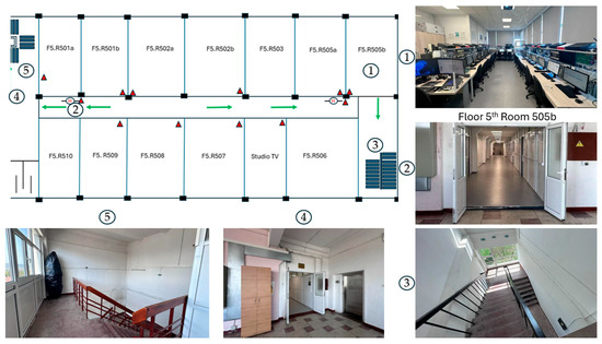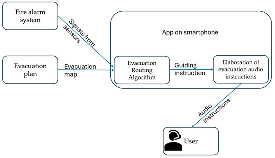 A relevant example of this type of system is the one proposed in [28], which introduced an IoT framework for intelligent evacuation. In practice, sensors connected via an ad-hoc network detect critical events (such as a fire outbreak or smoke presence) and transmit the data to a central server. This server then computes optimal evacuation routes, connected specifically to the building’s context, and communicates them to users through an intuitive interface. Essentially, the IoT network functions as the building’s central system, collecting data and providing a decision-making vector that guides people toward safe paths, avoiding fire hotspots, smoke areas, or overcrowded routes.