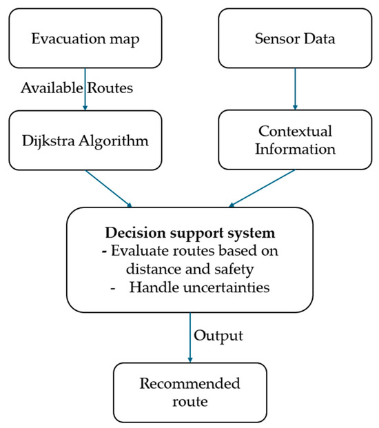 To avoid the overhead associated with dynamic routing protocols, reduce latency, and improve overall performance, a two-step routing protocol was elaborated. First, a static algorithm was used to calculate all possible routes from many interest points to exits. Then, based on information received from sensors, the decision-making system selects the shortest and safest path for evacuation. The information flow diagram is described in Figure 3.