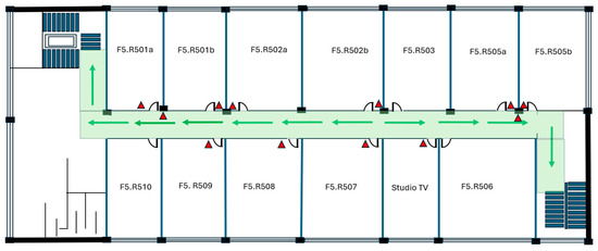 In buildings equipped with sensors and actuators, adaptive real-time guidance can respond swiftly to changing evacuation conditions. For example, ref. [29] describes an intelligent system that enables exit signs to dynamically alter their directions based on real-time data regarding fire locations and route conditions. In practice, these adaptive “Exit” signs can guide occupants toward the nearest safe exit. If a corridor becomes unsafe due to smoke or crowding, the system can redirect illuminated arrows toward alternative routes that have been assessed as safer.