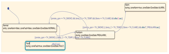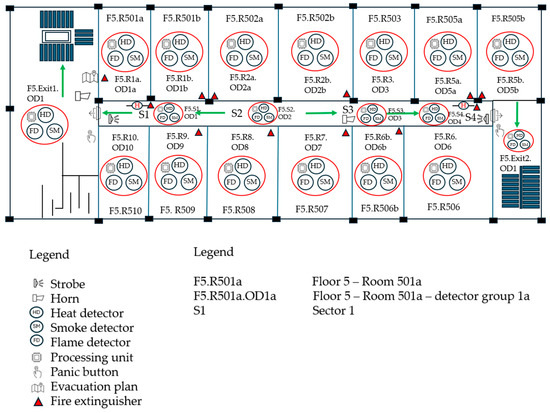 A fire detection and alarm system is a critical component of building safety, designed to ensure the early detection of fire and the timely alerting of occupants and emergency responders, thereby minimizing both casualties and property loss. In accordance with international standards (EN 54 series in Europe and NFPA 72 in the United States) [48,49], such systems consist of a network of interconnected devices and subsystems that provide detection, notification, control, and communication functions. At a high level, the system architecture includes a fire alarm control panel, various types of automatic fire detectors, audible and visual notification appliances (sirens, strobes), manual call points (panic buttons), and interfaces for communication with auxiliary building systems (e.g., public address for evacuation, automatic door release). In addition, the system must be capable of sending remote alerts, including alarms and fault conditions, to fire departments or central monitoring stations. The fire alarm control panel is the main component of the system, continuously supervising all initiating devices (detectors, manual call points) and controlling all notification appliances (sirens, strobes, relays). Under normal conditions, the panel indicates a normal state. However, upon fire detection or manual activation, it switches to an alarm state and initiates evacuation notifications. Modern panels also monitor and report issues such as open circuits and low battery levels [50]. The power architecture is dual: a primary supply from the mains and a secondary supply provided by backup batteries. According to NFPA and EN requirements, the batteries must support at least 24 h in standby mode, followed by 5–15 min in full alarm, depending on the presence of voice evacuation systems. Large facilities may also include automatic emergency generators, but battery backup remains mandatory as a last-resort power source.