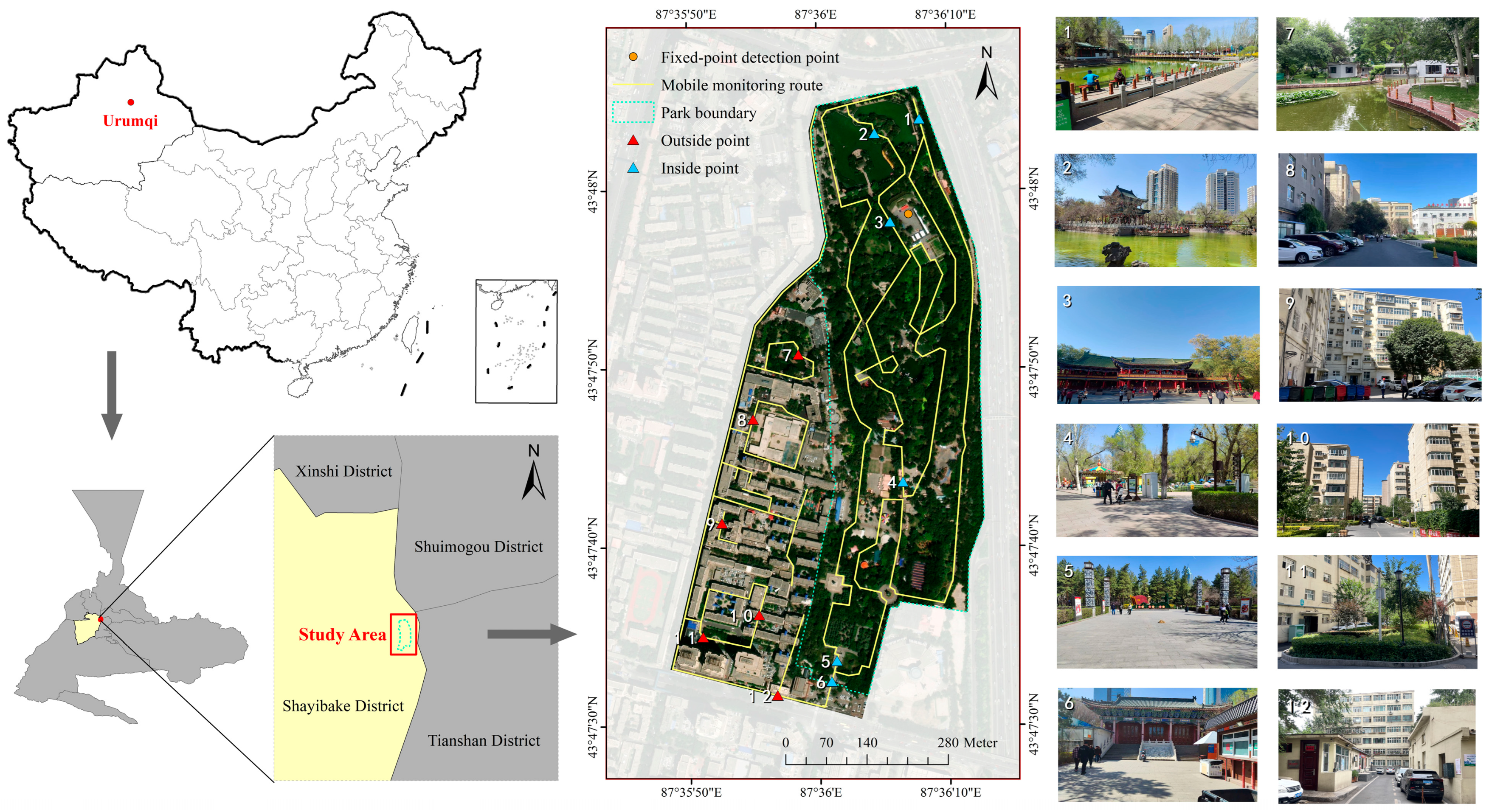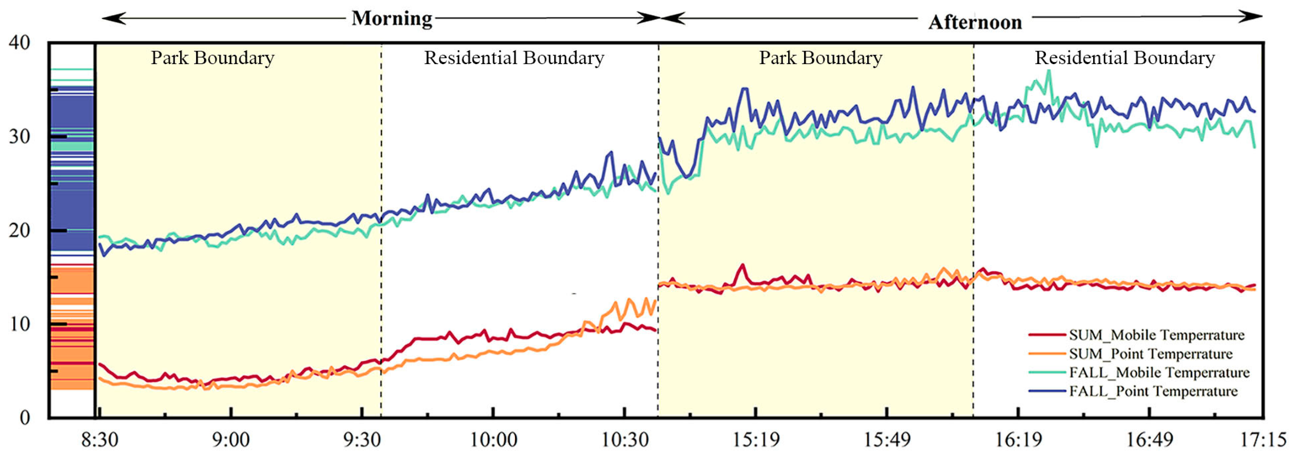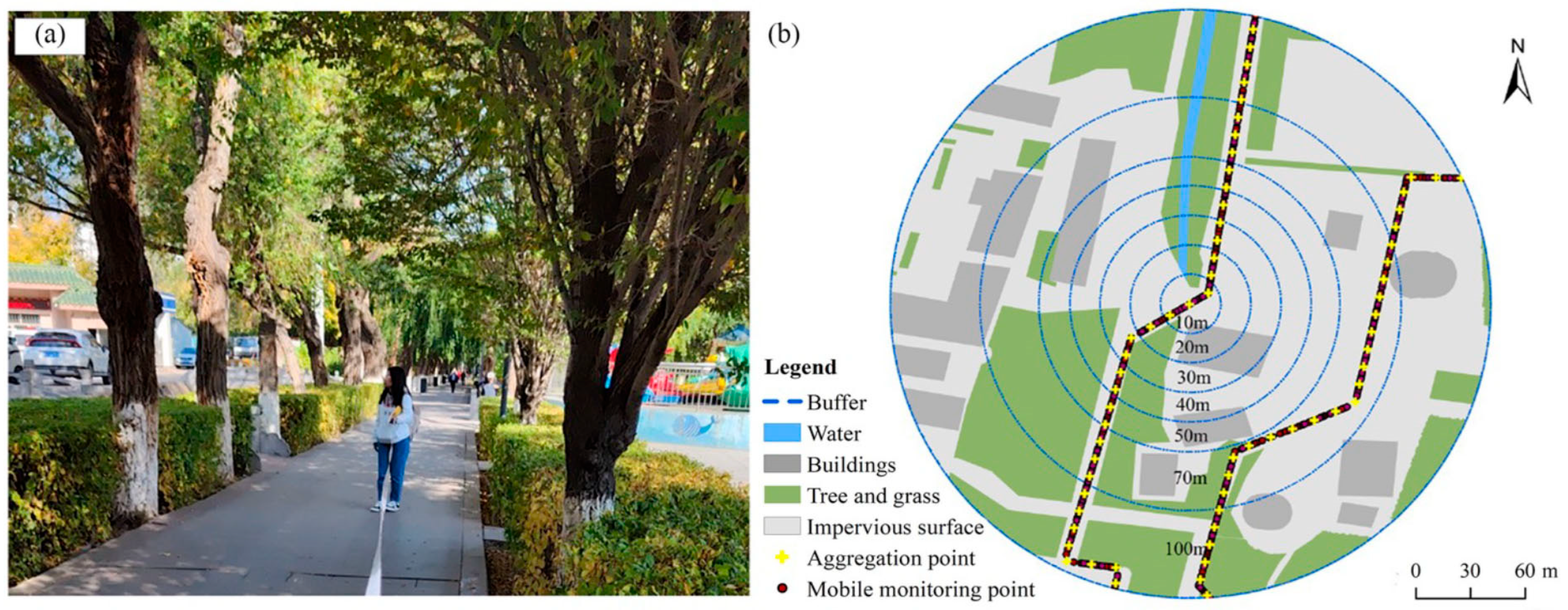 - Lam, C.K.C.; Alnaqshabandy, H.; Lewin, S.; Morewood, J.; Xie, X.; Goodhew, S. Making intra-urban monitoring ‘a walk in the park’: A mobile monitoring approach for assessing pedestrians’ environmental conditions. Build. Environ. 2025, 284, 113487. [Google Scholar] [CrossRef]