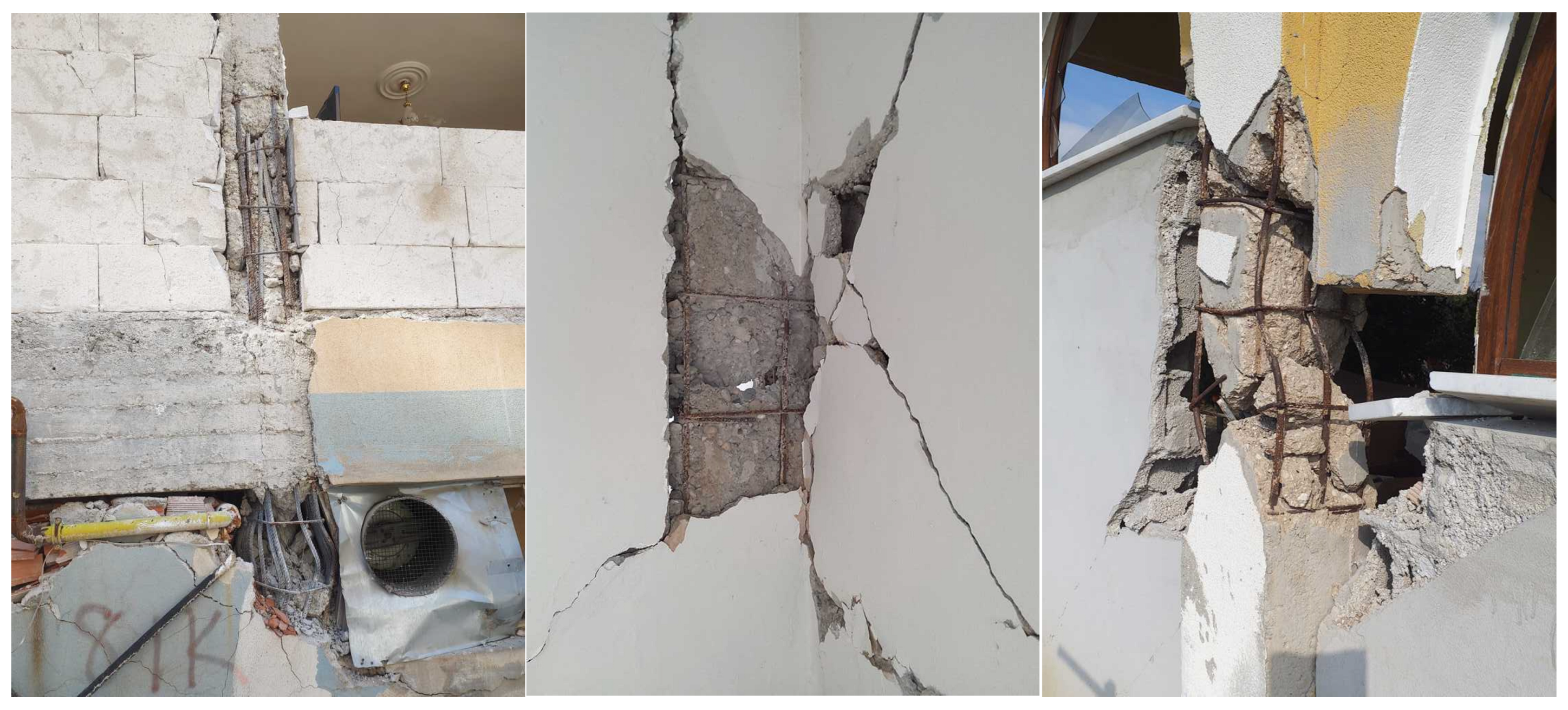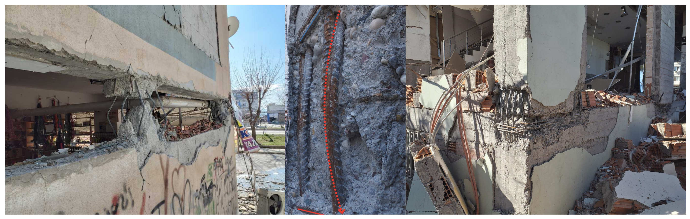 - Erbaş, Y.; Mercimek, Ö.; Anıl, Ö.; Çelik, A.; Akkaya, S.T.; Kocaman, İ.; Gürbüz, M. Design Deficiencies, Failure Modes and Recommendations for Strengthening in Reinforced Concrete Structures Exposed to the February 6, 2023 Kahramanmaraş Earthquakes (Mw 7.7 and Mw 7.6). Nat. Hazards 2025, 121, 3153–3194. [Google Scholar] [CrossRef]