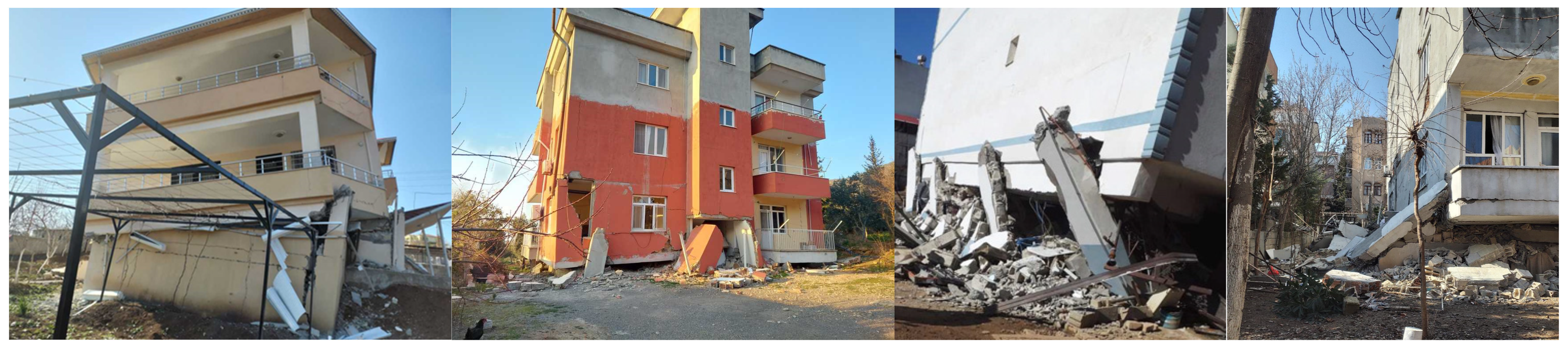 - Ivanov, M.L.; Chow, W.-K. Structural Damage Observed in Reinforced Concrete Buildings in Adiyaman during the 2023 Turkiye Kahramanmaras Earthquakes. Structures 2023, 58, 105578. [Google Scholar] [CrossRef]
