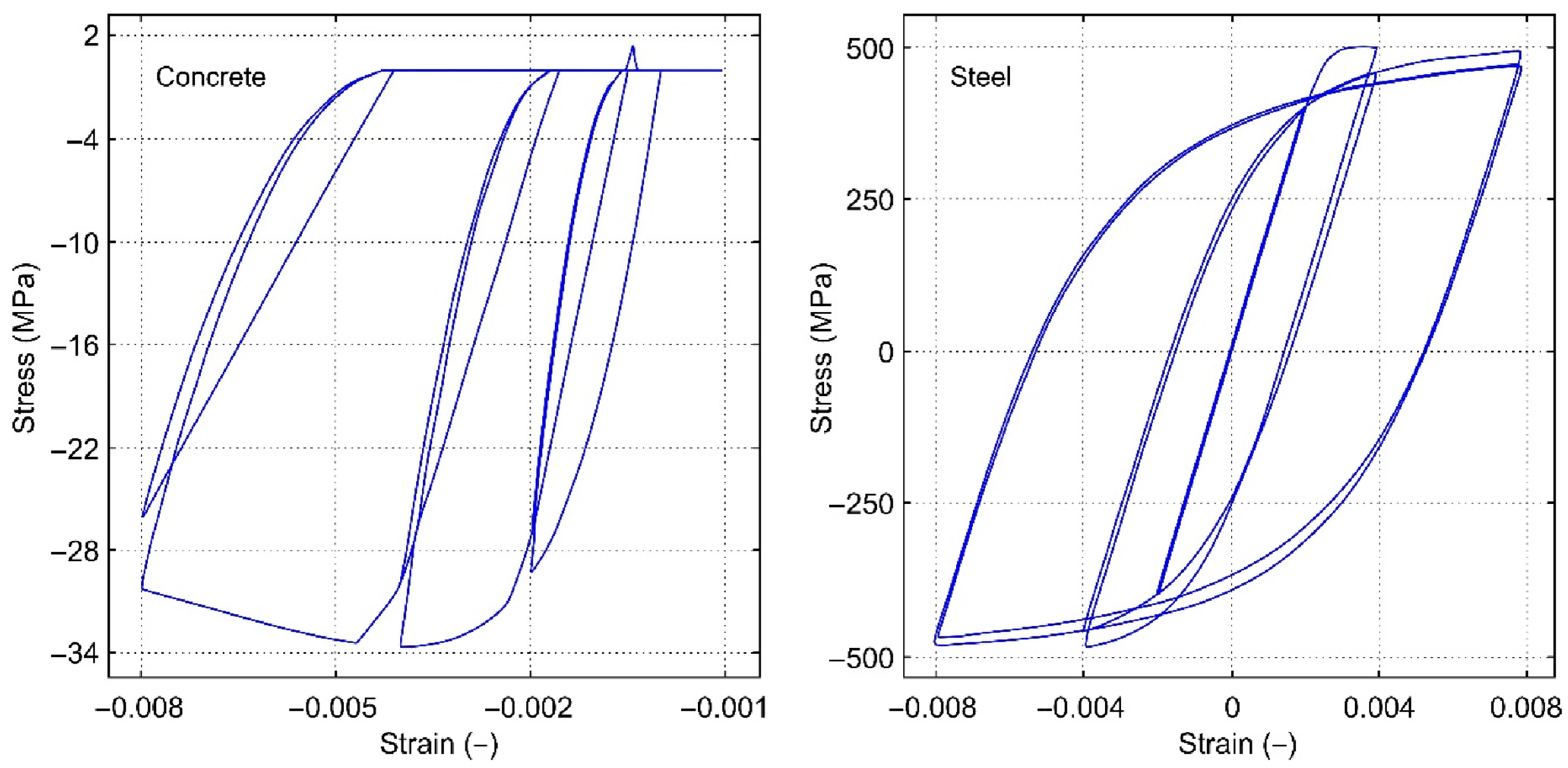 - Menegotto, M.; Pinto, P.E. Method of Analysis for Cyclically Loaded R.C. Plane Frames Including Changes in Geometry and Non-Elastic Behaviour of Elements under Combined Normal Force and Bending. In Symposium on the Resistance and Ultimate Deformability of Structures Acted on by Well-defined Repeated Loads; International Association for Bridge and Structural Engineering: Zurich, Switzerland, 1973; pp. 15–22. [Google Scholar] [CrossRef]