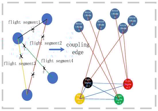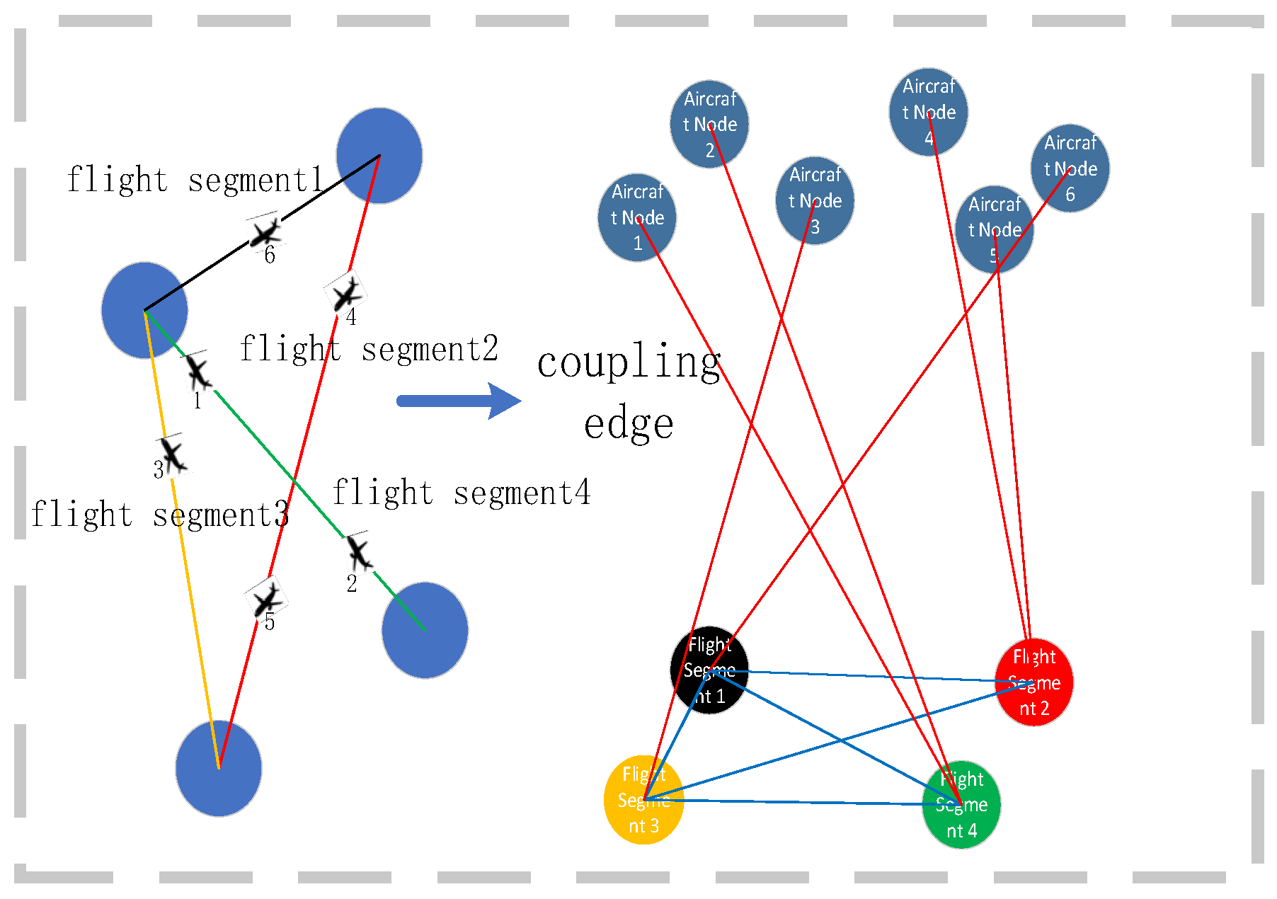 In Figure 2, the red line segments represent the coupling edges. Aircraft No. 1–2 are flying on Air-route No. 4, Aircraft No. 3 is on Air-route No. 3, Aircraft No. 4–5 are on Air-route No. 2, and Aircraft No. 6 is on Air-route No. 1. Thus, it can be known that there are edges connecting the nodes of Aircraft No. 1–2 to the node of Air-route No. 4, edges connecting the node of Aircraft No. 3 to the node of Air-route No. 3, edges connecting the nodes of Aircraft No. 4–5 to the node of Air-route No. 2, and edges connecting the node of Aircraft No. 6 to the node of Air-route No. 1.