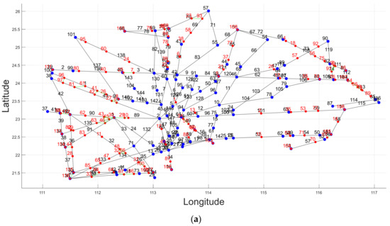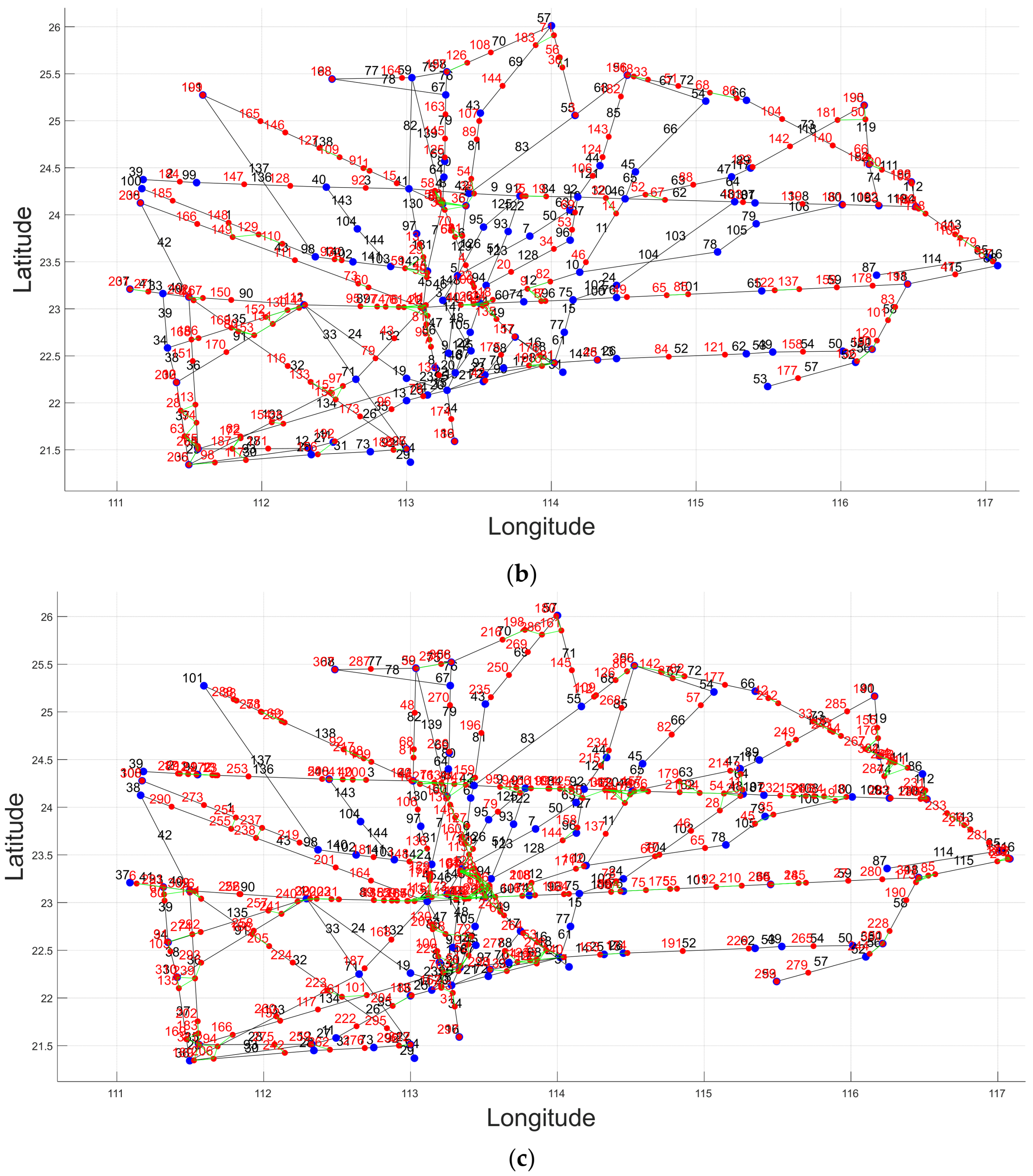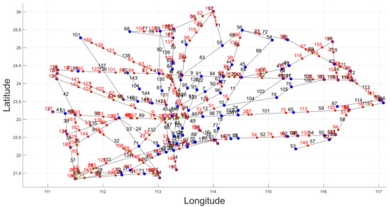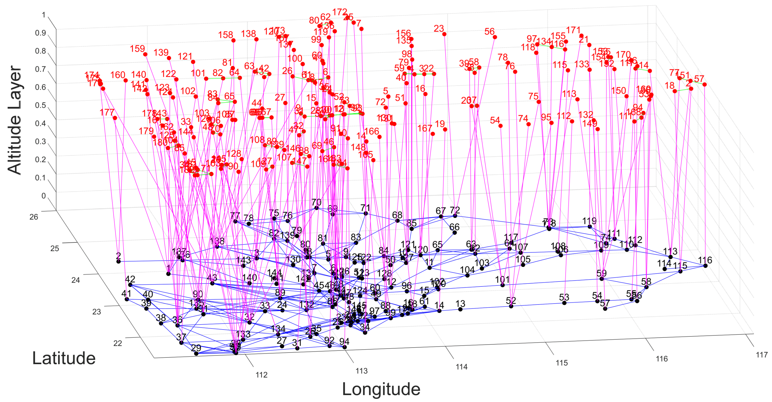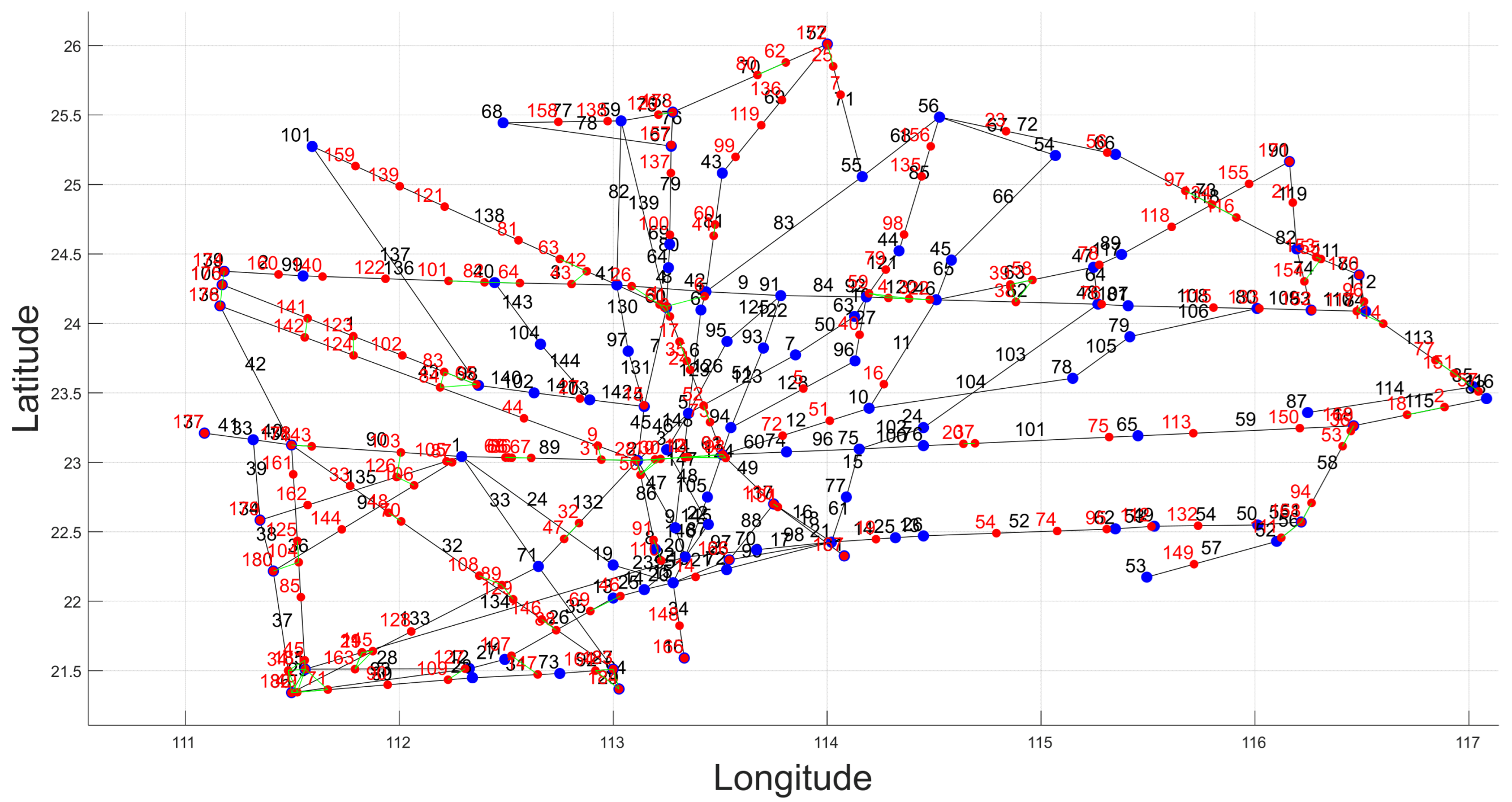 In the airway chart published by the Civil Aviation Administration of China (CAAC) on 1 August 2023, we identified the names of waypoints in the airspace over the Greater Bay Area, their latitudes and longitudes, and the connection relationships between them. We also collected the air traffic flow data over the Guangdong–Hong Kong–Macao Greater Bay Area at 14:00 on 18 June 2024. The air situation map at this moment is shown in Figure 3. The red dots and numbers represent the operating aircraft and their serial numbers, and the black line segments represent the air-routes. Based on the method described above, we judged the flight conflict situations between aircraft. If there is a flight conflict between two aircraft, there will be a green edge between the corresponding aircraft nodes.