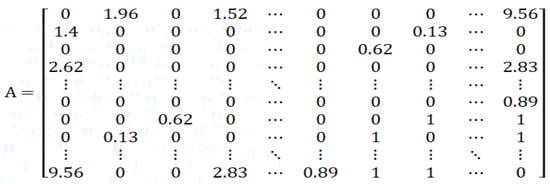In the interdependent network model, we can use the weighted adjacency matrix of the interdependent network to describe the air traffic situation in the multi-airport terminal area of the Guangdong–Hong Kong–Macao region. Based on the air situation map at the current moment, the weighted adjacency matrix A of the interdependent network model at this moment is calculated, as shown in Figure 4 below.