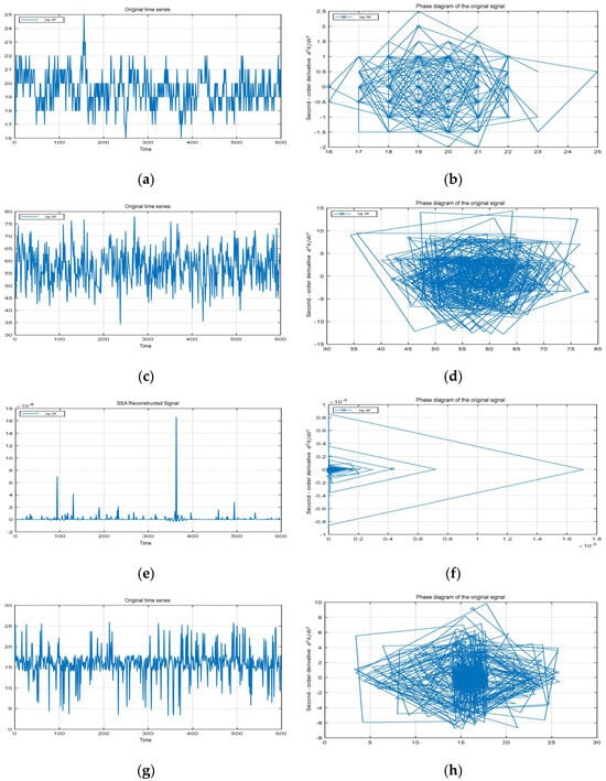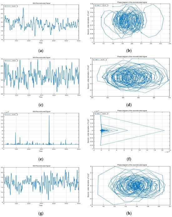 As can be seen from Figure 7, the original time series of node characteristics can accurately reflect the instantaneous changes in node characteristics, but it lacks smoothness as a whole and has many obvious turning points, which makes it difficult to judge its changing trend. The corresponding two-dimensional phase portrait shows a certain regularity, but the change pattern of the curve is not obvious, and the overall graph appears rather chaotic with low smoothness. The main reason for these problems is that the node characteristic data are calculated from the actual air situation and are affected by the internal chaos of the system. To solve this problem, we used the Singular Spectrum Analysis method [19] to smooth the original data and obtain the smoothed-node characteristic sequences and two-dimensional phase portraits, as shown in Figure 9.