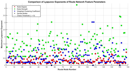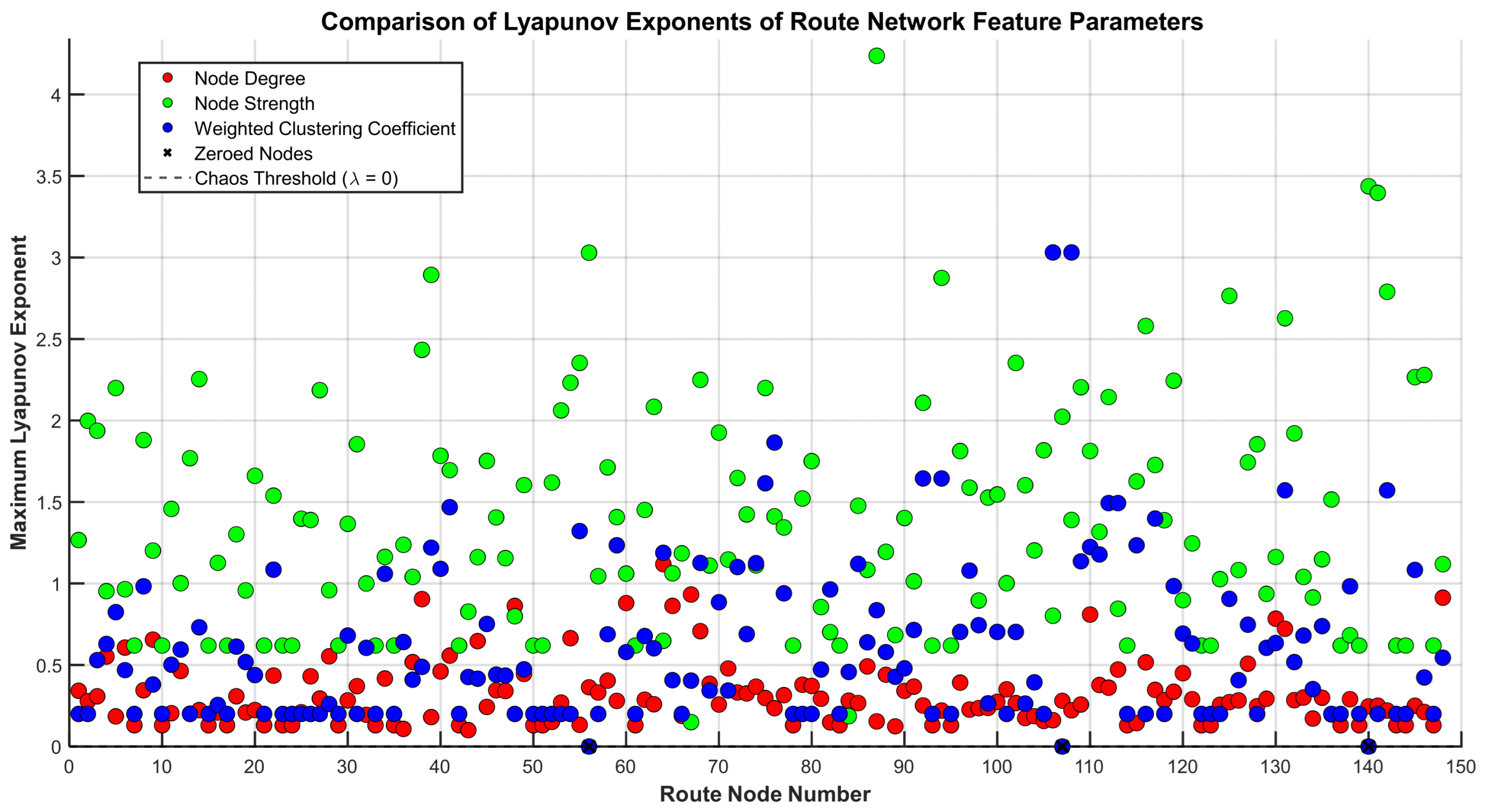 From Figure 8, it can be observed that the maximum Lyapunov exponents corresponding to the time series of air-route node characteristics are all greater than or equal to 0. This result indicates that the time series of node characteristics exhibits chaotic features. The chaos of the system means that the changes in the evolution law of the air traffic system are predictable to a certain extent. It is worth noting that the maximum Lyapunov exponents of some nodes are 0. This is because these nodes are in an isolated state during the evolution process, with relatively stable states, and are not significantly affected by external factors or have weak interactions with other nodes.