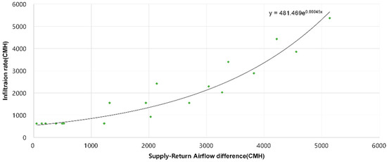 First, the difference between supply and return airflow rates and the indoor–outdoor pressure difference were experimentally derived as having an exponential relationship. This relationship was then applied to an airtightness-based leakage function to predict infiltration rate. This is significant as it overcomes the limitations of previous studies, which either relied on database-based airtightness values or focused solely on control performance.