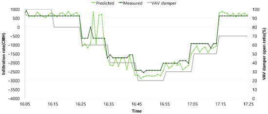 The average error between predicted and measured infiltration rate is approximately 270 CMH. The coefficient of variation in the root mean squared error (CVRMSE) between the predicted and measured infiltration rate was 11.05%, showing better results than the guidelines of ASHRAE (≤30%) and IPMVP (≤20%). Therefore, the infiltration rate prediction model derived in this study, utilizing the relationship between supply and return airflow rates and the pressure difference in the AHU, is deemed suitable for predicting infiltration rate in occupied buildings.