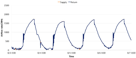 To determine the airflow supplied and returned indoors and the resulting pressure differential, it is necessary to measure the airflow and pressure differential. Changes in airflow were measured by adjusting fan speed and VAV damper opening rate using the building automation system (BAS). The differential pressure sensor measuring the indoor–outdoor pressure difference is installed on the exterior wall of the target space. The specifications of the differential pressure sensor and airflow measurement device are presented in [Table 3].