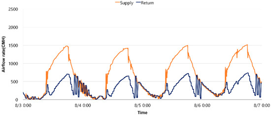 During the simulation period when the pressure control method considering infiltration rate was applied, the indoor temperature was stably maintained within the set temperature range 24 ± 1 °C, satisfying the indoor thermal environment. The Control_RA method dynamically adjusts the supply and return airflow rates considering the indoor and outdoor air infiltration rate, and shows the supply and return airflow rates when operating in this way. In [Figure 9], in a high occupancy state such as Case A, the supply and return airflow rates were 1197 CMH and 467 CMH on average, respectively. In Case C, when the occupancy rate decreased, they decreased to 694 CMH and 184 CMH on average, respectively. This indicates that the pressure control method considering infiltration rate efficiently adjusts the supply and ventilation demand while maintaining the indoor and outdoor pressure difference. The difference between the supply and return airflow rates was adjusted according to the change in the occupancy rate as a result of reflecting the infiltration rate. When the occupancy rate was high, the difference between the supply airflow rate and the return airflow rate was 730 CMH, and when the occupancy rate decreased to 50%, the difference decreased to 510 CMH. This contributes to suppressing infiltration rate by maintaining the indoor space in a positive pressure state.