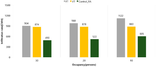 When the proposed pressure control method was applied, when the number of occupants was 30, the Control_RA method showed an infiltration rate reduction effect of approximately 45.8% compared to the FT method and approximately 43.9% compared to the VT method. When the number of occupants was 20, the Control_RA method showed an infiltration rate reduction effect of approximately 46.7% compared to the FT method and approximately 40.5% compared to the VT method. When the number of occupants was 10, the Control_RA method showed an infiltration rate reduction effect of approximately 46.1% compared to the FT method and approximately 31.5% compared to the VT method. Therefore, it was confirmed that the infiltration rate reduction effect was more than 30% in all cases.