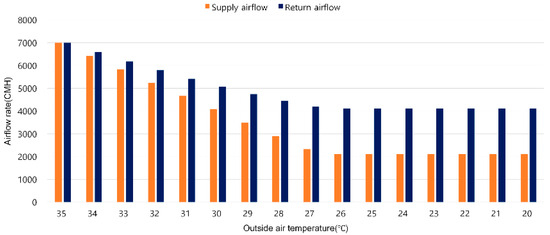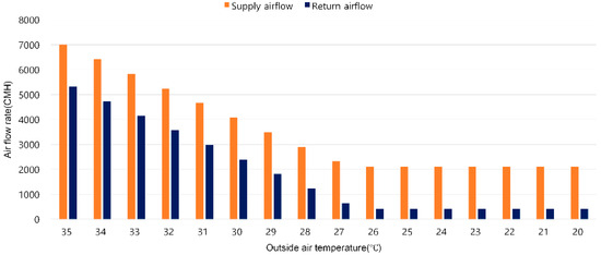 To estimate the total fan energy consumption in August according to fan control methods in VAV systems, the bin method was utilized. The bin method divides continuous data into ranges and analyzes the frequency of data occurrence within each range [20]. [Figure 11] shows the changes in supply airflow rate and return airflow rate according to outdoor temperature changes under fan tracking control. The occupancy load is 40, the maximum occupancy. In the high outdoor temperature range (35 °C to 27 °C), the supply airflow rate remains relatively high, and the return airflow rate also shows a similar trend. This is interpreted as a result of the high cooling load, which increases the supply airflow and correspondingly increases the return airflow rate. As the outdoor temperature decreases from 26 °C to 20 °C, the indoor–outdoor temperature difference narrows, reducing heating and cooling loads. Consequently, the supply airflow rate decreased, while the return airflow rate tends to remain constant. The difference between the supply airflow rate and the return airflow rate was greatest when the indoor load was low and the supply airflow rate was operated at the minimum airflow rate, generating an infiltration rate load of approximately 2000 CMH. The infiltration rate load caused by the increase in the return airflow rate compared to the supply airflow rate leads to an increase in the cooling load. When calculated with blank data, this increases by approximately 44% compared to the existing indoor load.