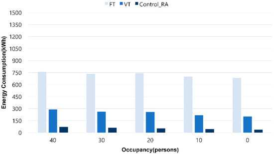 [Figure 13] shows the results of comparing the supply fan energy consumption by pressure control method (FT, VT, Control_RA) according to the occupancy level. When the energy consumption was analyzed by dividing the occupancy level into 40, 30, 20, 10, and 0 people, the FT method showed the highest energy consumption and the Control_RA method recorded the lowest consumption. Specifically, when the cooling load was high with 40 people in the room, the supply fan energy consumption of the FT method was 1204 kWh, that of the VT method was 1130 kWh, and that of the Control_RA method was 1073 kWh. When the room was not occupied, the FT method was 1092 kWh, the VT method was 1016 kWh, and the Control_RA method was 960 kWh.