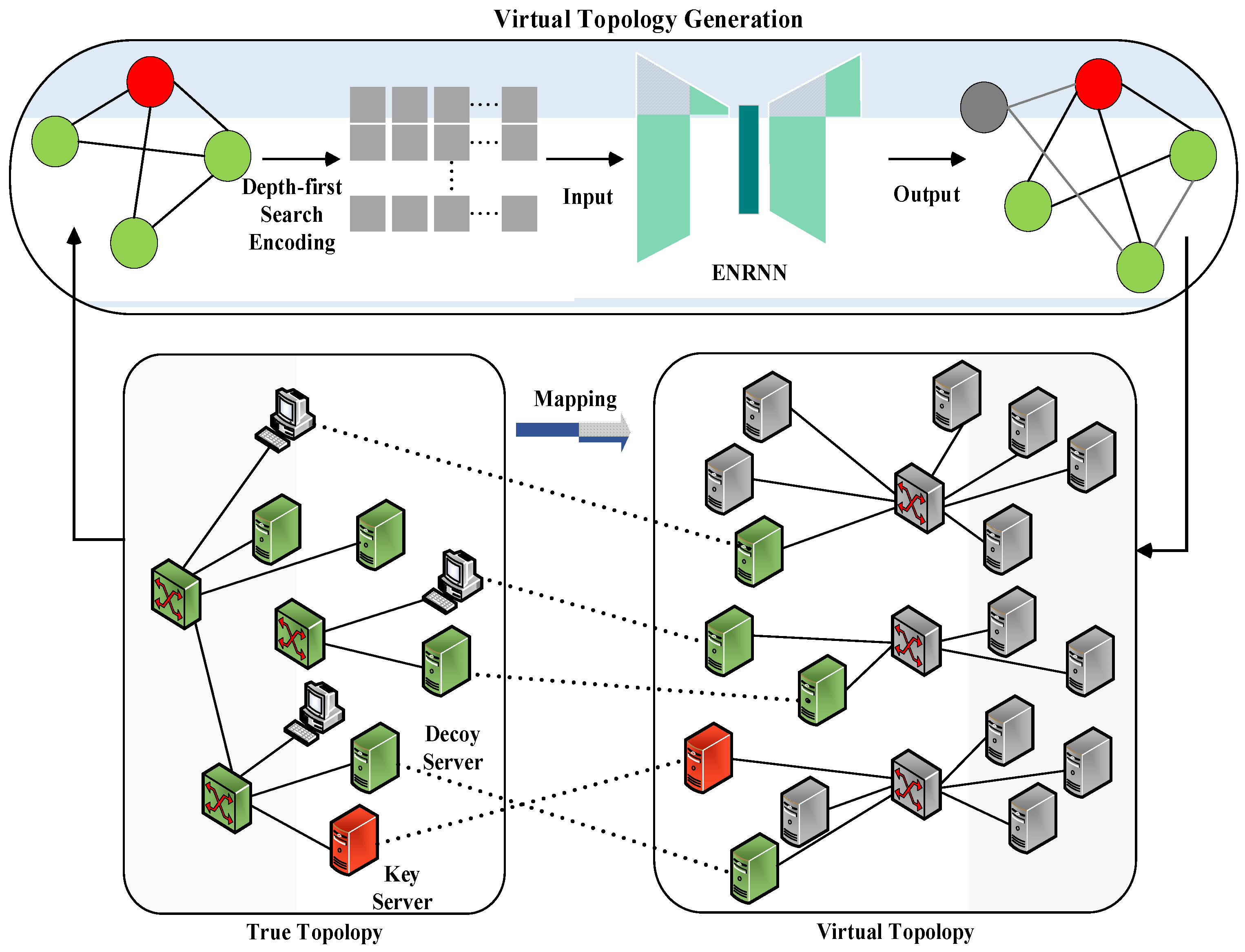 - Parameters for the GNN training and IP-hopping mechanisms: ENRNN, implemented using the PyTorch 1.11.0+cu115 version, was applied to generate random virtual topologies for deception defense. During training, the Internet Topology Zoo dataset was split in an 8:1:1 ratio for the training, validation, and test sets. The training and validation sets were used for model training and validation, respectively, whereas the test set evaluated the modeL′s learning performance for the given task. The training process involves generating positive and negative edge samples, forward propagation, calculating the cross-entropy loss, and back-propagation to train the model. During the IP-hopping phase, IP address pools of the high frequency and low frequency hopping space were set to 152.0.0.0/24 and 10.0.0.0/24. Initial periods of high frequency and low frequency hopping were 5 s and 180 s. The code is available at https://github.com/lchang1977/Deceiving-Defense/tree/main (11 October 2025).