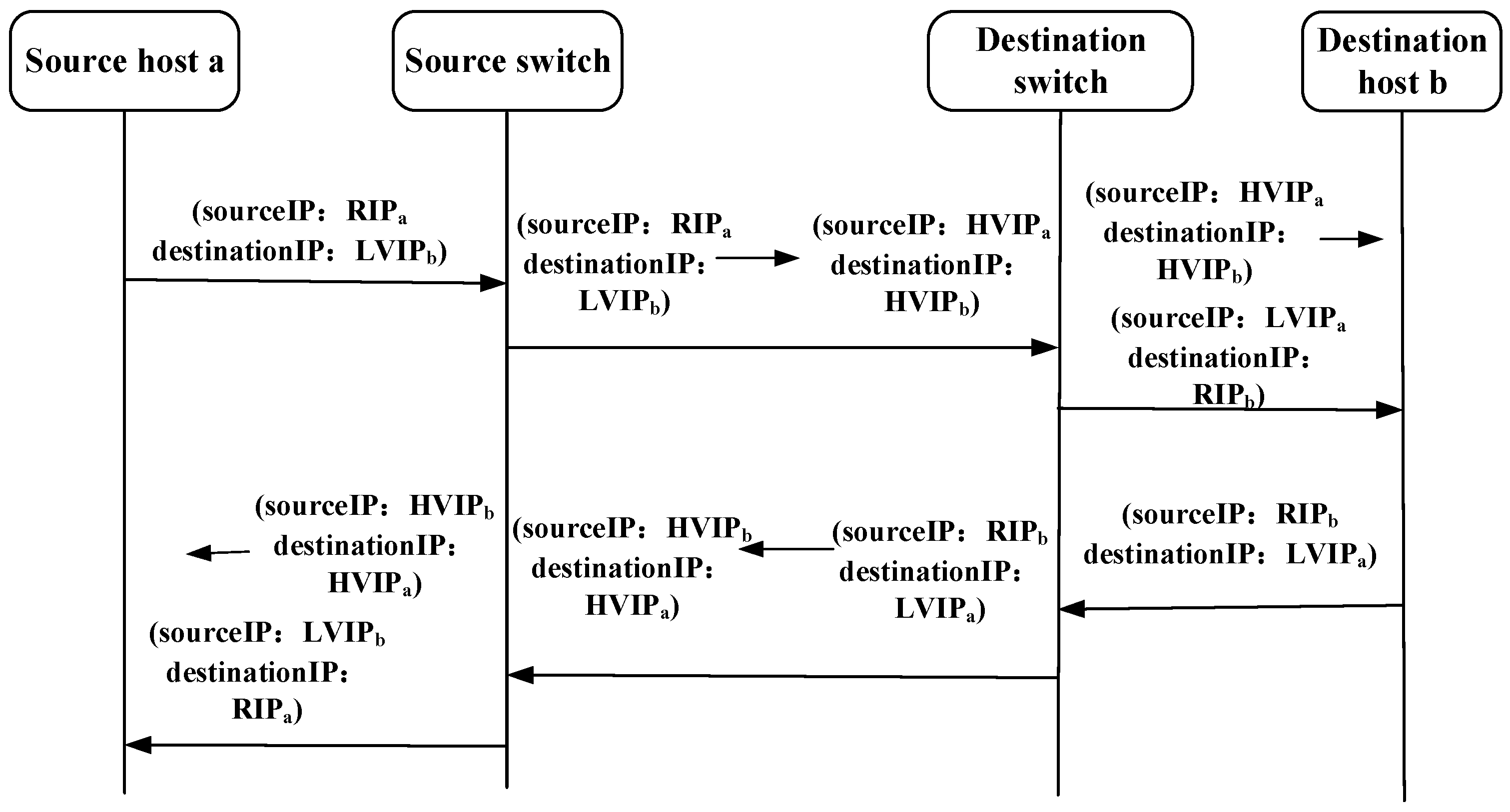 - The source switch modifies the packet addresses from (HVIPb, HVIPa) to (LVIPb, RIPa) and forwards them to the source host a, completing the communication process.