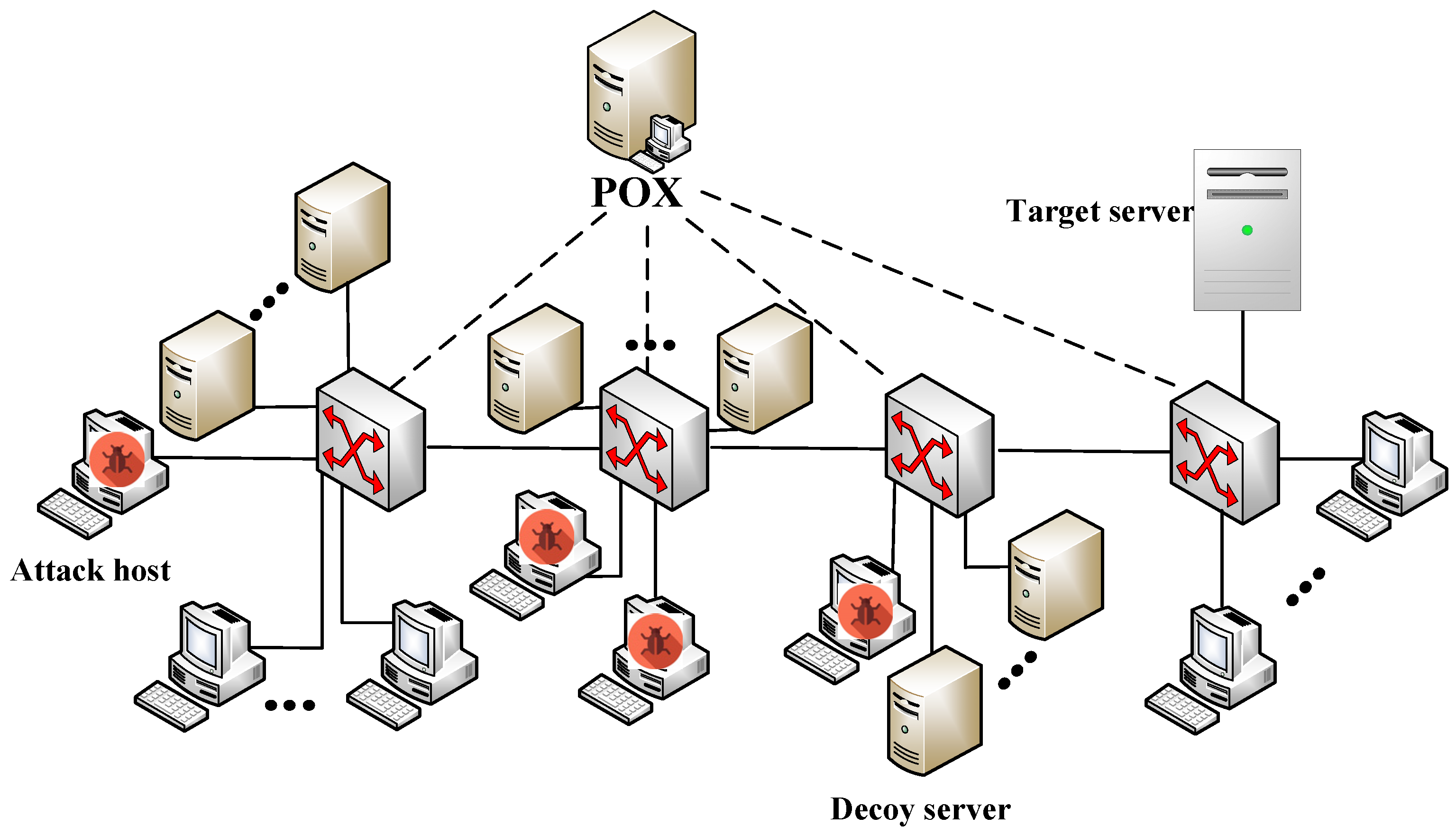 - Network size: The simulated network had 50 nodes, which consisted of 24 guest hosts, 4 OpenFlow vSwitches, 4 attack hosts, 16 decoy servers, a target server and a controller. The POX was selected as the SDN controller for generating and delivering defense mechanisms as well as for traffic control. The bandwidth of all links in the network was set to 300 kb/s.