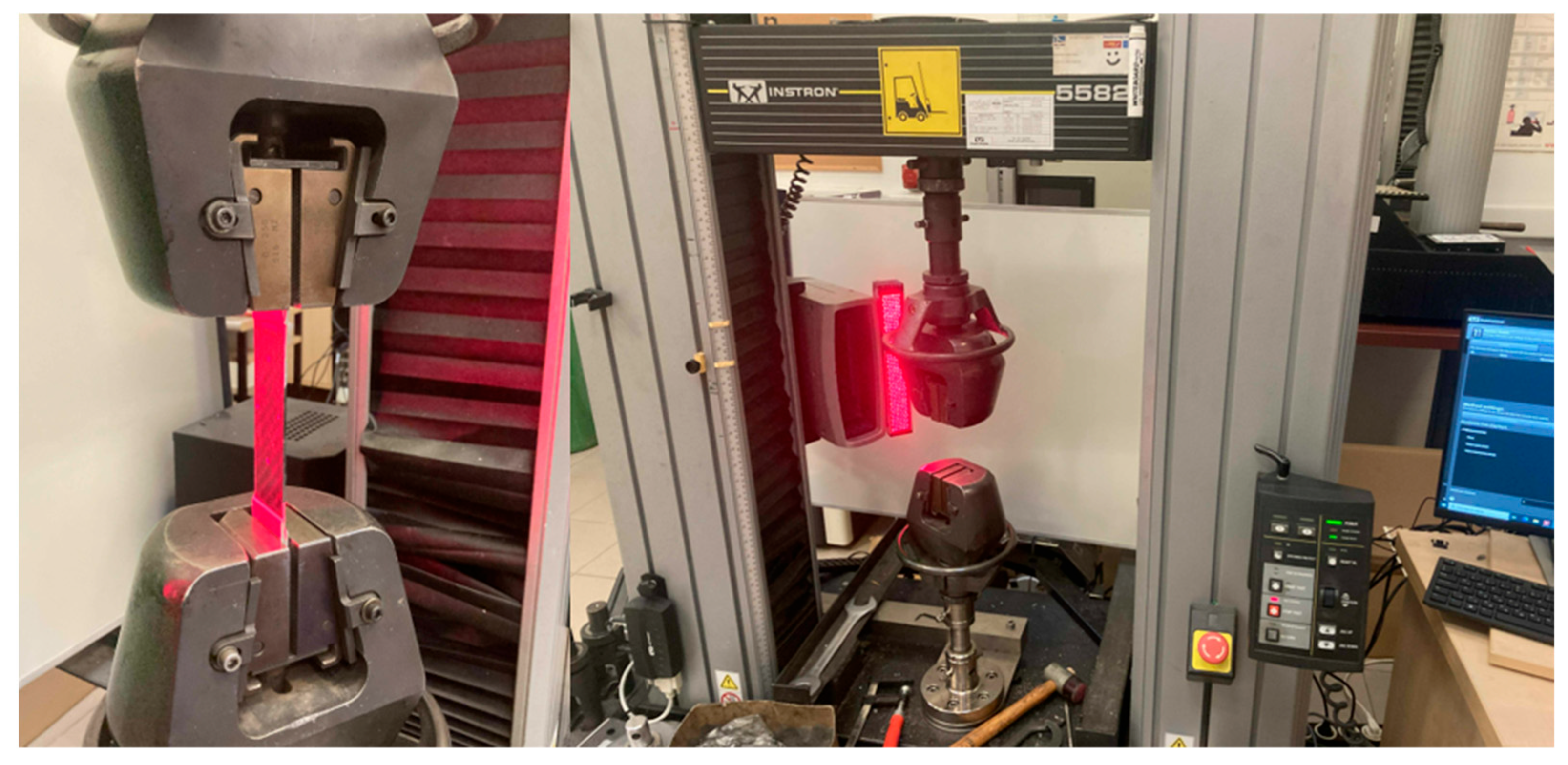 The production of testing specimens followed a standardized process to ensure consistency and accuracy. Testing (Figure 6) was conducted according to ASTM D 3039 [22] and D 3818/D 3518M [25] standards, due to the availability of the necessary testing equipment and the familiarity with these standards. The tensile tests for twill fabric assessed properties along its main axis, while UD specimens were evaluated in both the fiber and transverse directions. Additionally, shear tests, conducted with a rotated fiber alignment, analyzed the shear force between fibers under tension. While compression tests were planned, they were ultimately omitted due to the associated costs. Instead, values were estimated based on data sheets and measurements from similar materials [26].