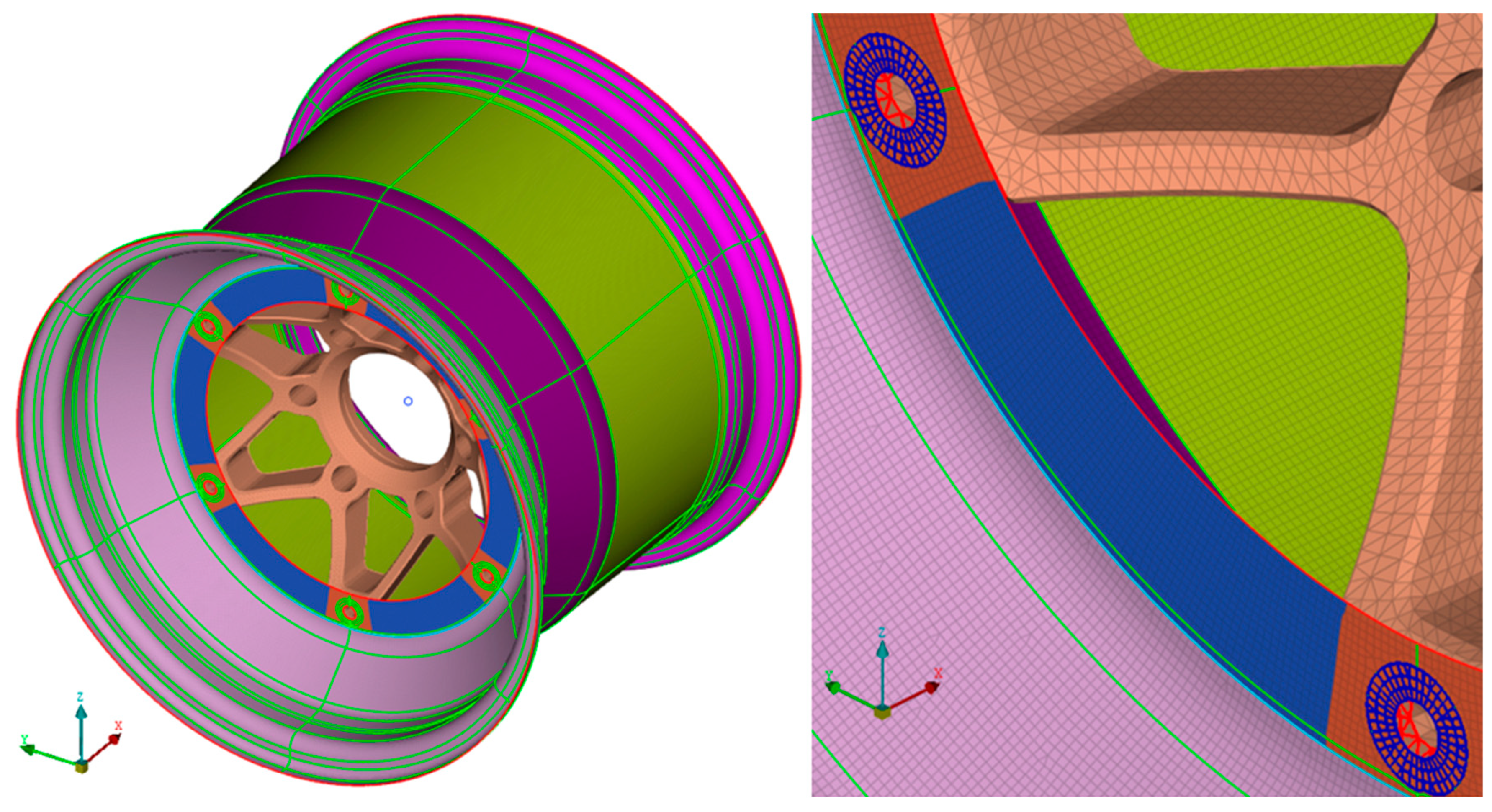 In the first step, the CAD model was imported into ANSA v23.1.2 pre-processing software, where irrelevant details were simplified and data conversion errors were corrected to ensure connected elements. The rim model was simplified by using a 1/6th CAD section, meshed with first-order shell elements at the mid-surface (Figure 7). Initial element size trials (4 mm, 2 mm, and 1 mm) indicated that a 2 mm size worked well, but further refinement was needed at the rim’s center part, ultimately using a uniform 1 mm mesh. The wheel center, a secondary component, was modeled with 2 mm tetra elements to balance accuracy with a reduced element count.