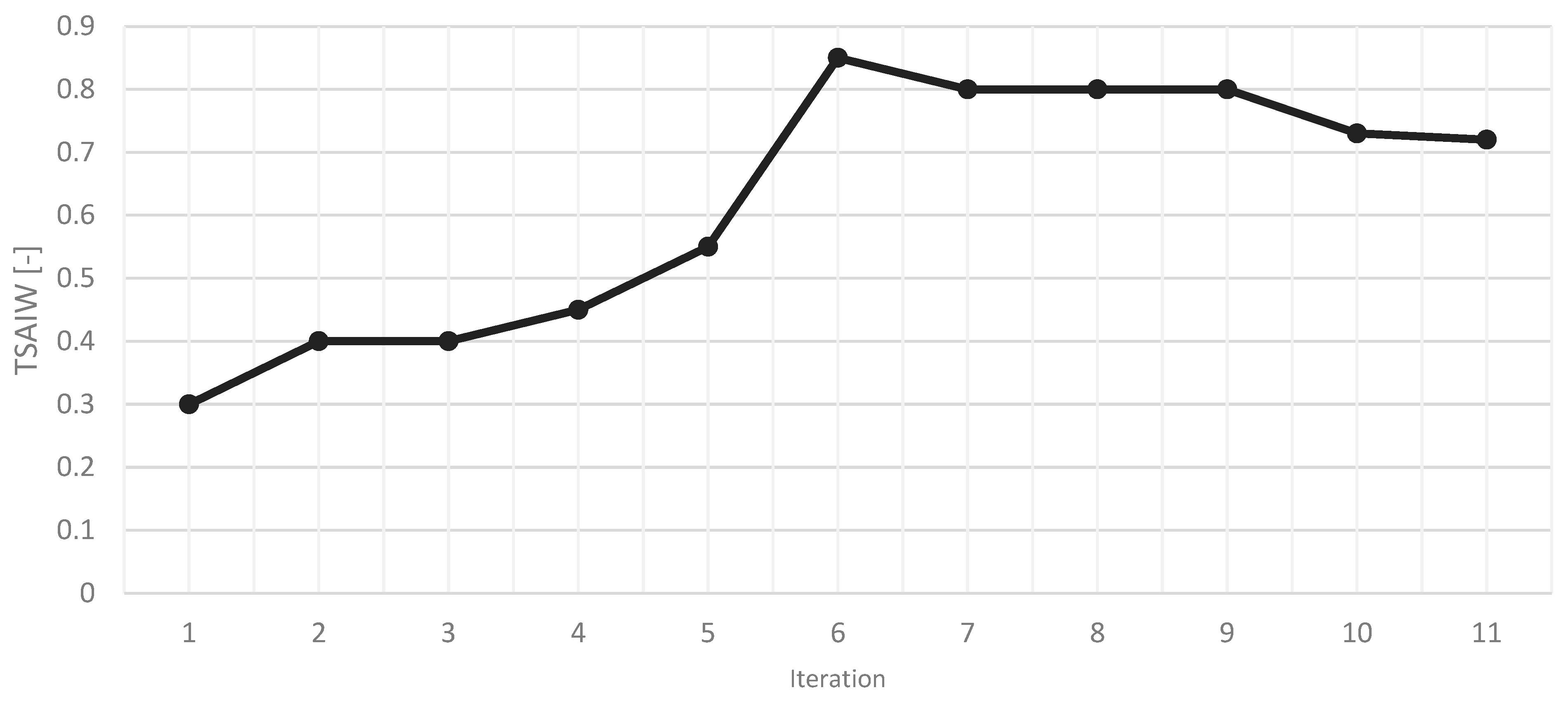 The iteration method is based on the flowchart shown in Figure 2, with a goal of 3.00 mm displacement and Tsai–Wu failure criterion (TSAIW) of 0.833. Iteration results for multiple parameters throughout the design are shown in Figure 9, Figure 10, Figure 11, Figure 12, Figure 13, Figure 14, Figure 15 and Figure 16, showing a clear trend towards the expected final results. Note that from iteration 5 to 6, a great jump in the results can be seen due to modification of the layer sequence in multiple layer zones (Table 6).