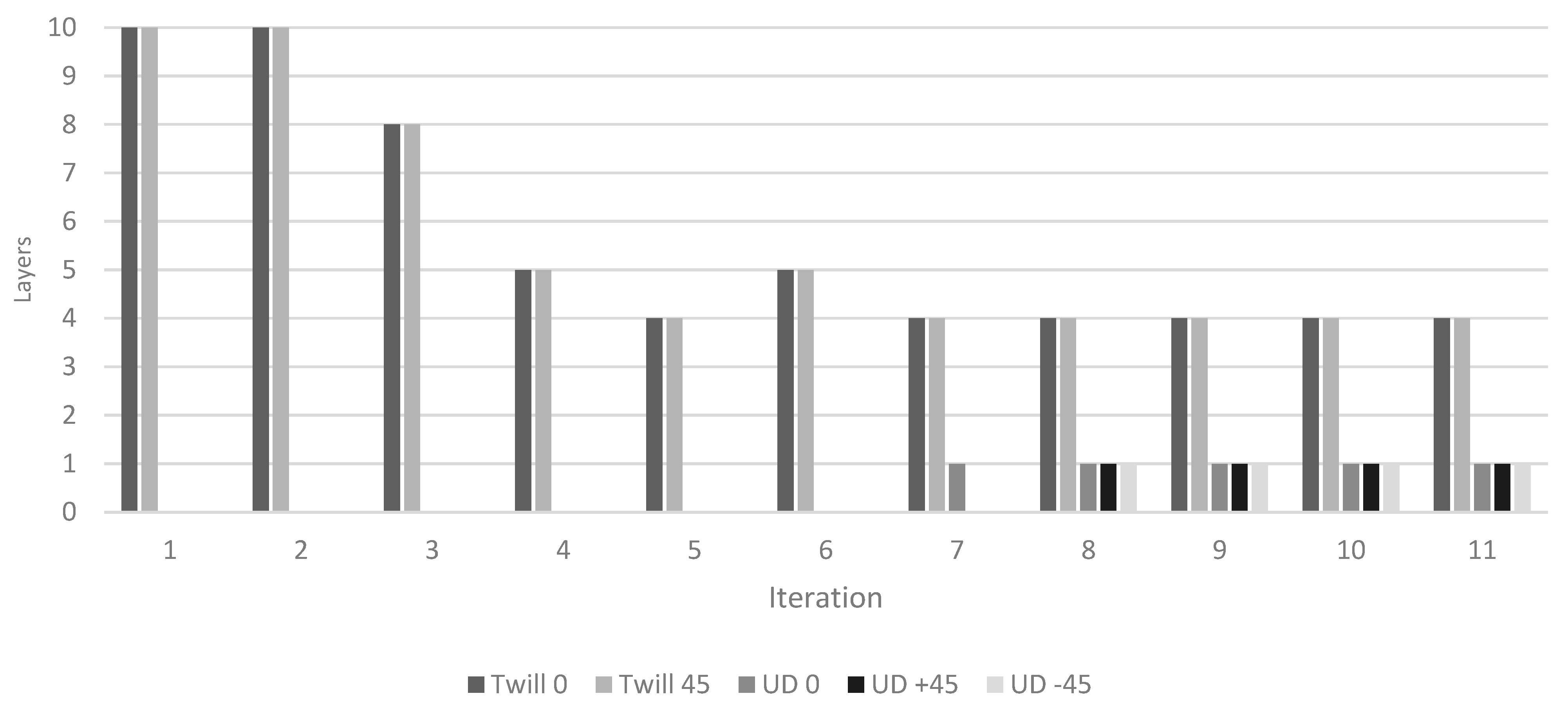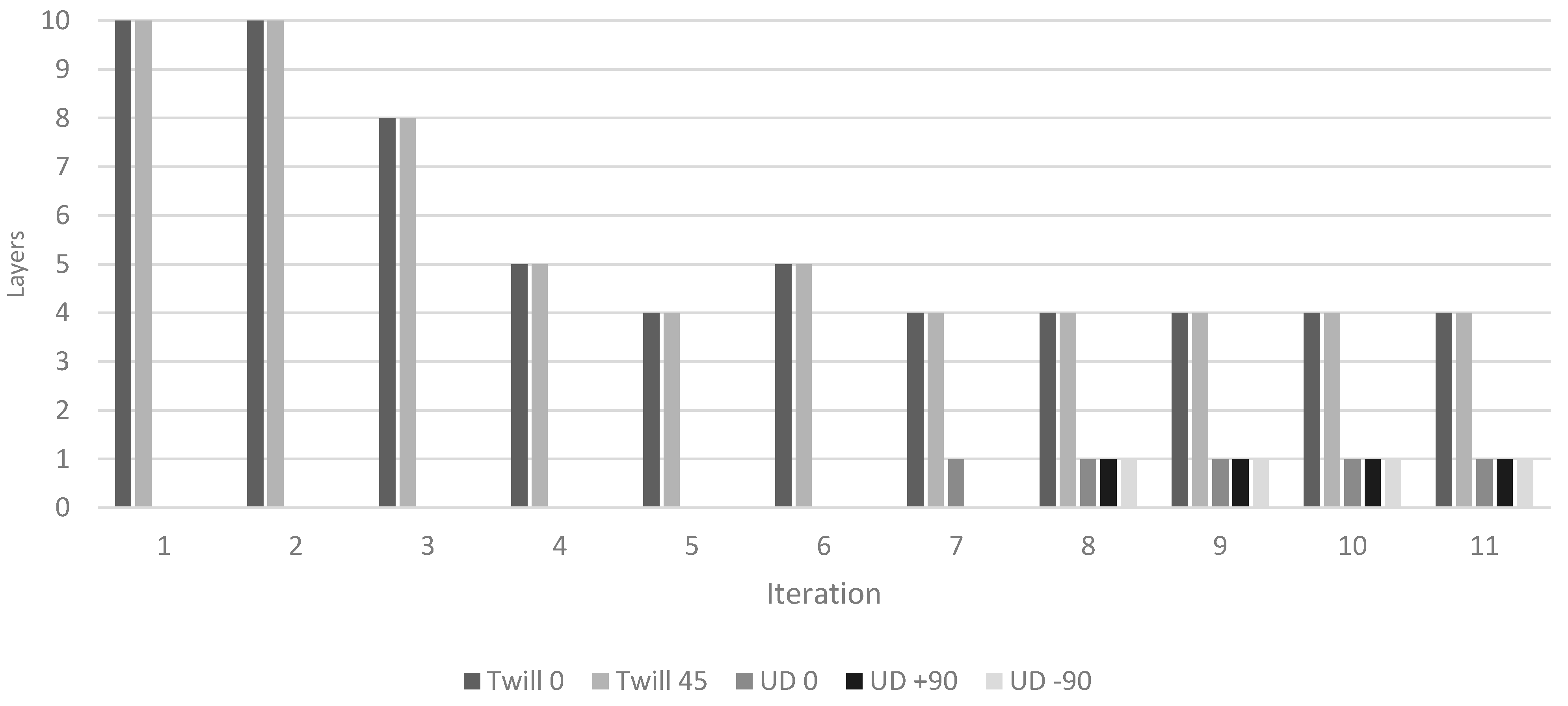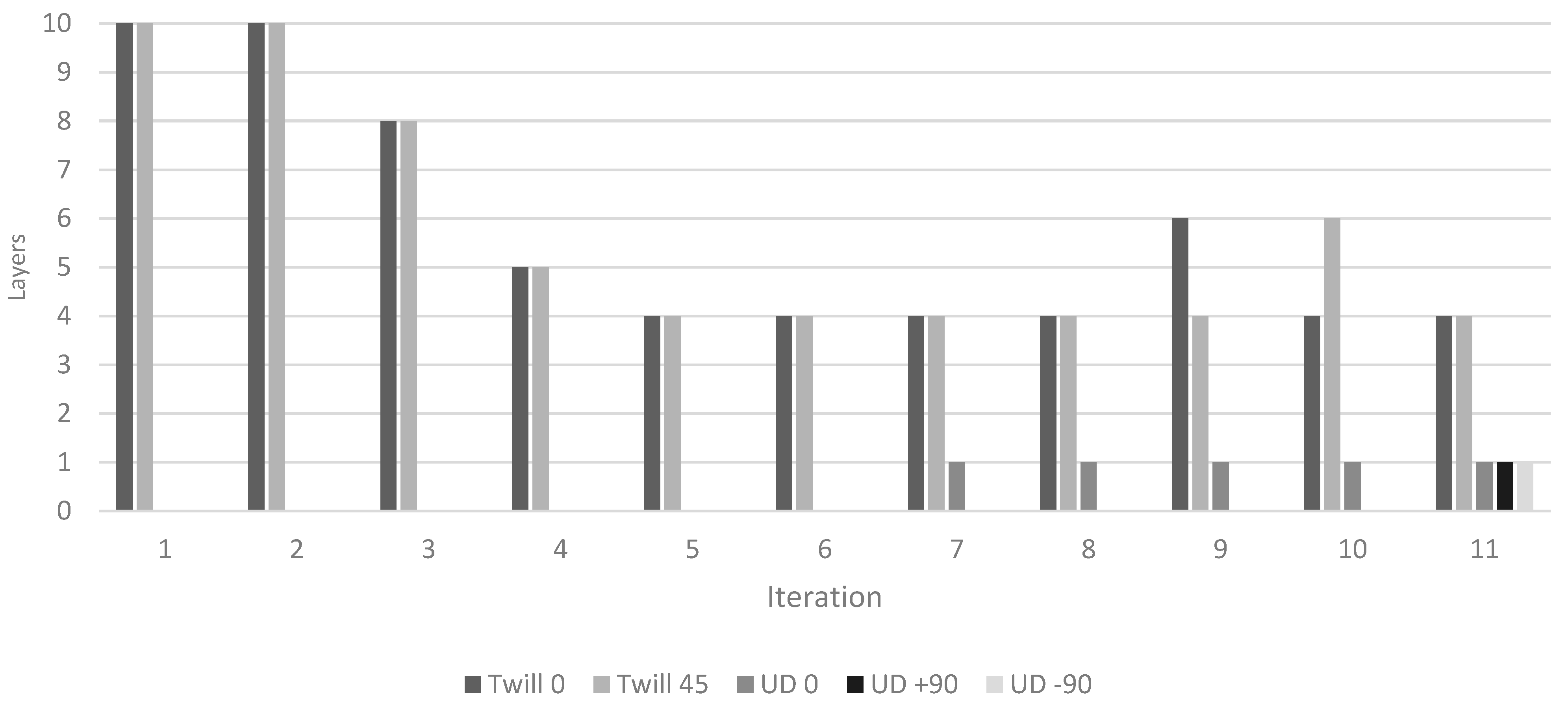 The start of the layup iteration was a symmetrical alternating layup of 10 layers of twill at 0° and 10 layers of twill at 45°. It was selected as an easily modifiable base that guarantees that the iteration starts with an upward trajectory (in stress and failure criterion).