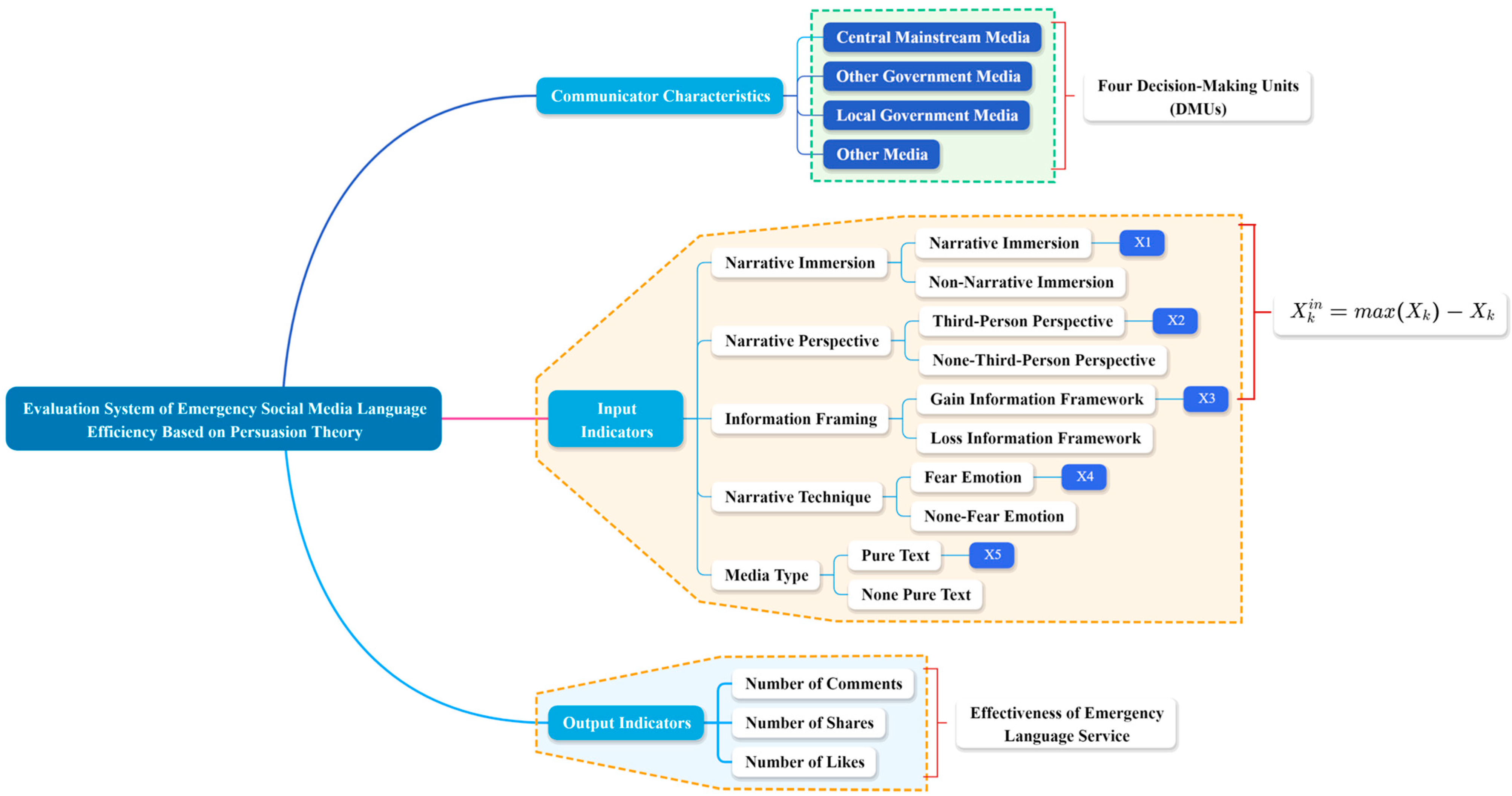 4]. In emergency response, information is not necessarily “effective simply by being disclosed.” Its impact depends on “who releases it, how it is articulated, and in what context it is presented.” Hovland’s persuasion theory provides precisely such an analytical perspective: persuasion is a systematic process driven by the communicator, the persuasive content, and the communication context. Therefore, this study used the 2025 Beijing Extreme Rainfall Event as a case study to analyze information disseminated via social media during the incident’s emergency response phase. Based on persuasion theory, this study constructed an evaluation model for emergency social media language systems by examining communicators and persuasive content. Employing the DEA-BCC model to compare the efficiency of input and output indicators across different decision-making units (communicators), it assesses the effectiveness of current emergency social media language services. Recommendations are proposed to enhance the efficiency of these services, aiming to provide theoretical support for improving the scientific rigor and effectiveness of emergency management language services.