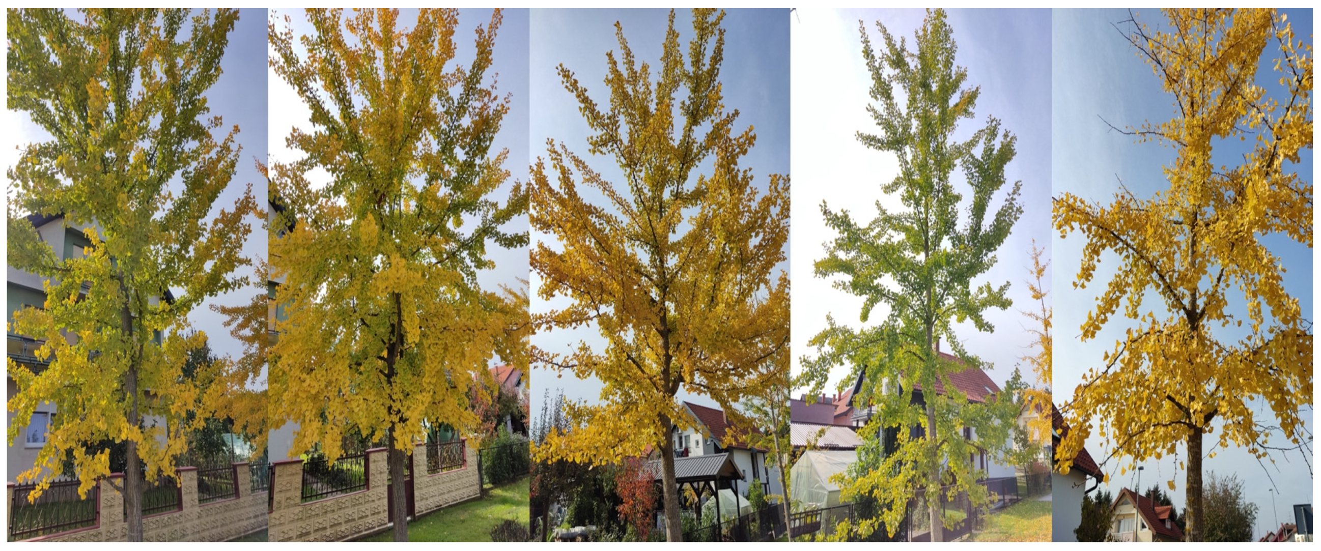 - Zhang, H.; Yu, P.; Song, M.; Li, D.; Sheng, Q.; Cao, F.; Zhu, Z. Leaf Color Changes and Photosynthetic Characteristics of Five Superior Late-Deciduous Ginkgo Biloba Cultivars. HortScience 2021, 56, 1416–1422. [Google Scholar] [CrossRef]