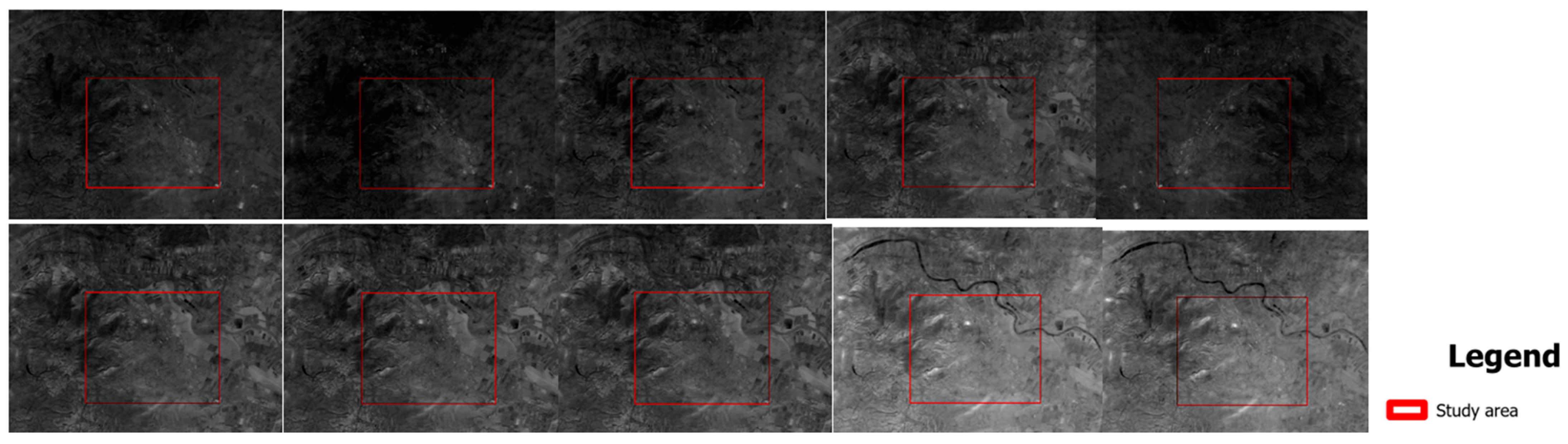 - Clipping maps—defining and extracting the area of interest (AOI) by cutting the satellite scenes to match the study boundaries;