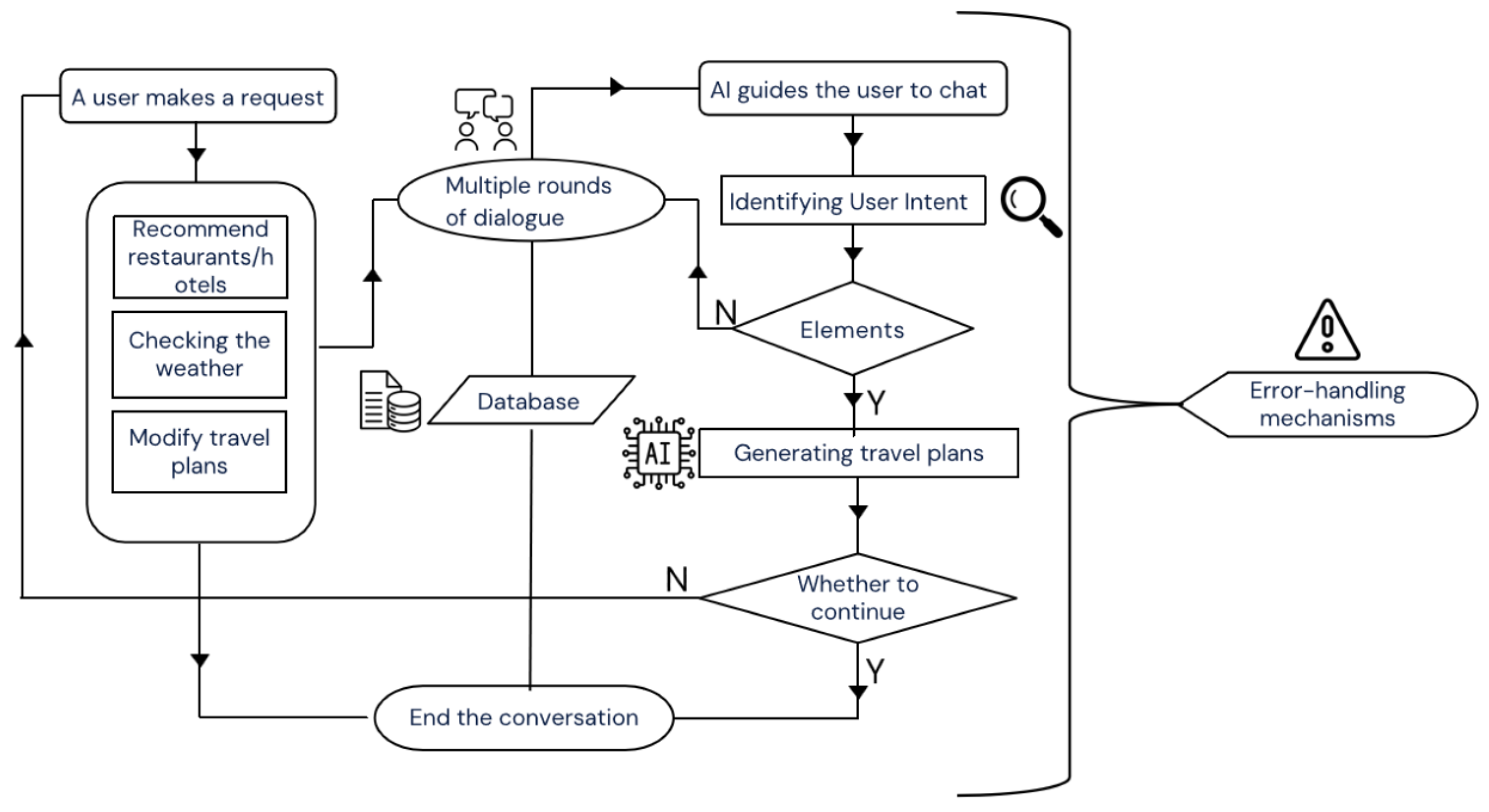 Currently, there are many tourism industry apps on the market, such as the recommendation systems of trip, Xiaohongshu, and other platforms [3]. These systems usually rely on historical user data and recommendation algorithms to provide travel suggestions, but there are the following problems: First, the recommendation algorithms of many platforms are mainly based on collaborative filtering or user portraits and lack a deep understanding of the user’s specific intentions, resulting in generalized recommended content and difficulty meeting personalized needs. Second, in the travel planning process, users must search for information across multiple platforms, leading to fragmentation of information and increasing decision-making costs [4].