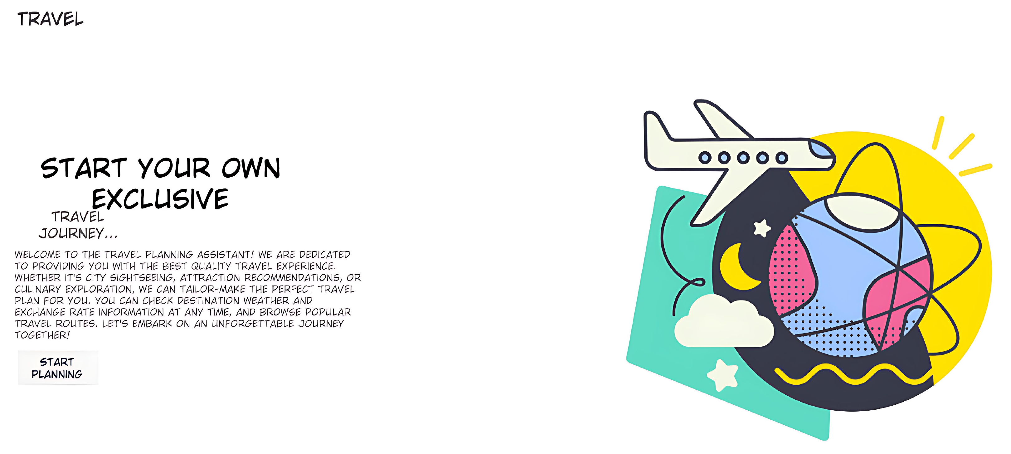 The welcome page is designed to provide an intuitive and attractive initial experience, as shown in Figure 3. It adopts a simple and elegant layout, with a text introduction on the left and a travel-themed picture on the right to enhance the sense of immersion. The title “Start your travel journey” complements the introduction and allows users to quickly understand the core functions. The “Start Planning” button uses high-contrast colors to guide users to interact. The overall color scheme is mainly blue and white, conveying an atmosphere of free exploration.