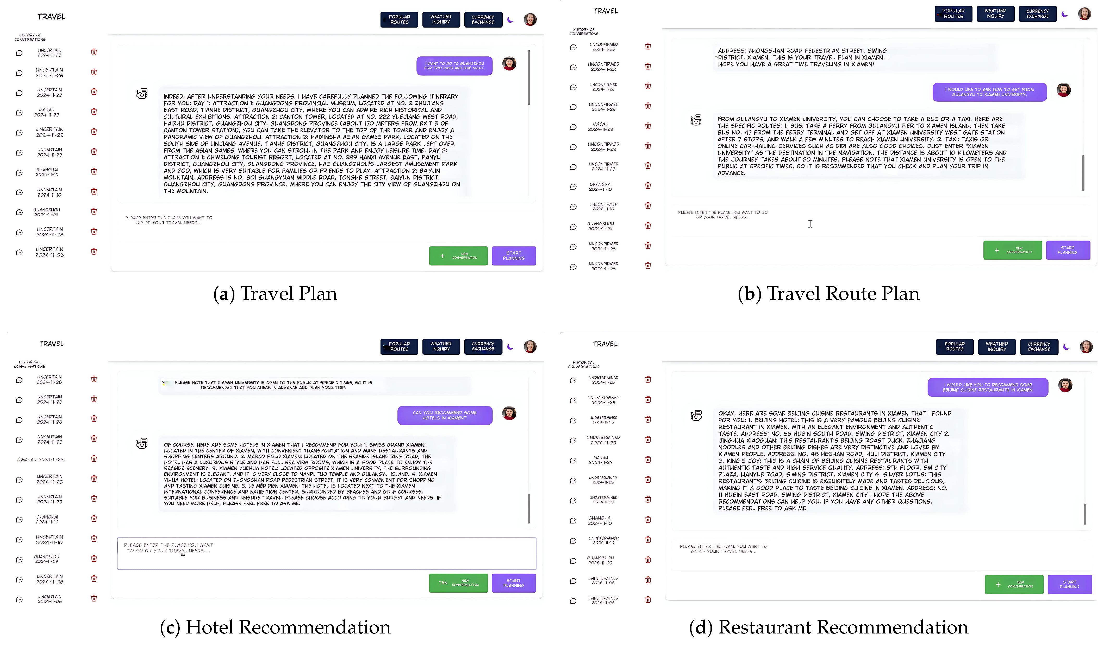 Figure 4 presents the conversation interface of the proposed system, which is composed of several functional modules. Specifically, the sidebar is used to display conversation records, allowing users to view and delete past chat histories. The title bar provides multiple functional buttons, including “Popular Routes,” “Weather Query,” and “Currency Exchange,” as well as theme-switching options (dark and light mode). To further demonstrate the versatility of the system, four representative application scenarios are illustrated in Figure 4a–d, corresponding to travel planning, route planning, hotel recommendations, and restaurant recommendations, respectively.