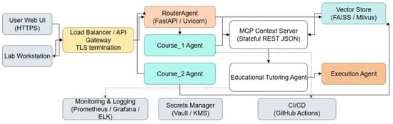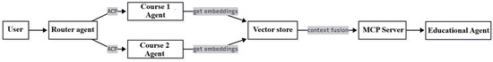 To address several of these issues, Retrieval-Augmented Generation (RAG) has been suggested as a viable solution. RAG enhances factual grounding and lowers the frequency of unsupported assertions in model outputs by fusing a generative model that is conditional on retrieved passages with a retrieval module that retrieves curated, domain-specific resources [6]. Particularly in knowledge-intensive tasks like problem-solving and programming support, recent RAG applications in education indicate improved answer accuracy and better alignment with course materials [7,8]. However, the existing literature still fails to adequately address two practical issues. First, modularity and reuse are hampered by the lack of established communication patterns across the many system components (retrievers, context managers, pedagogical rule engines, and generating agents), which makes multi-agent orchestration and interoperability frequently ad hoc. Second, the system’s ability to maintain consistent, course-level context over time and to reason about student progress is constrained since context management across multi-turn conversations and across course sessions is usually restricted to ephemeral session information or simple memory buffers.